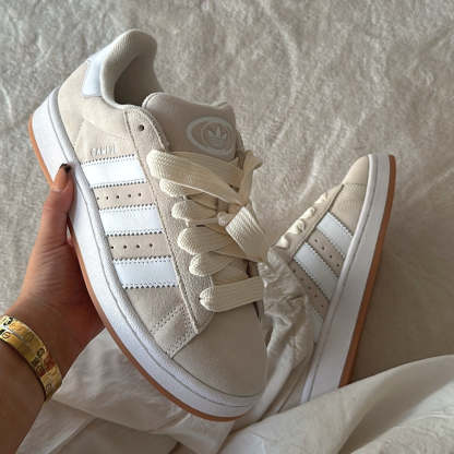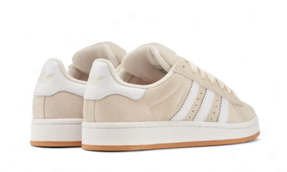 Adidas Campus 00s Wonder White Gum -mallissa on beigestä nahasta valmistettu pohja, jota koristavat kolme paksua valkoista raitaa sivupaneeleissa ja brändin tunnusominaisuudet.