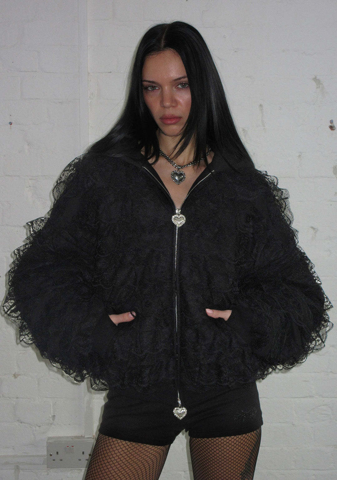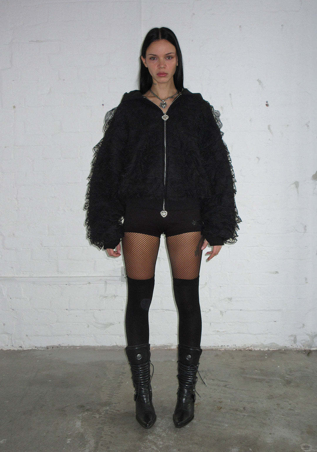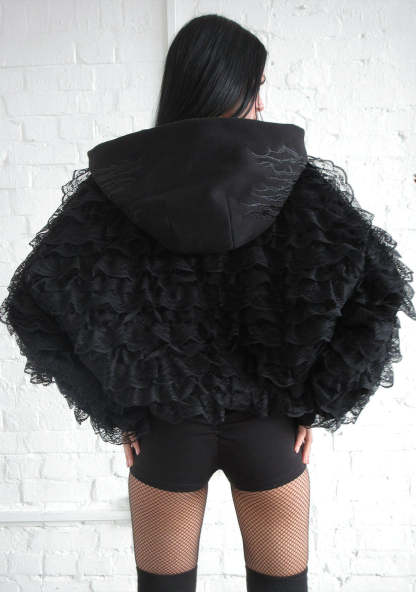 BAD ROMANCE LACE RUFFLE ZIP HOODIE BLACK
