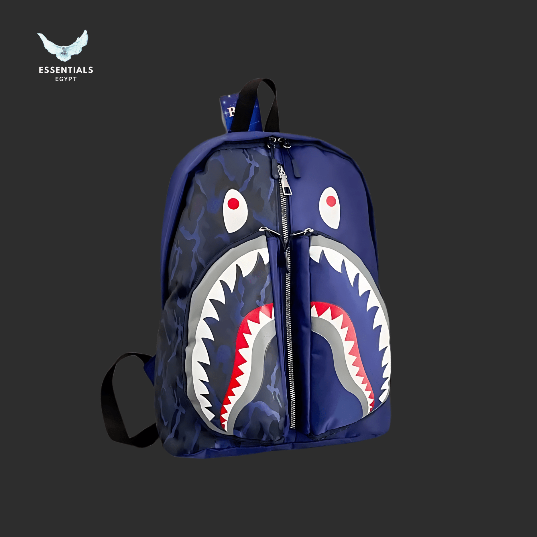 Vibrant blue BAPE backpack with signature color camo and shark graphic. Elevate your streetwear fit. Available in Egypt. Dimensions: 40cm,16cm,29cm.
