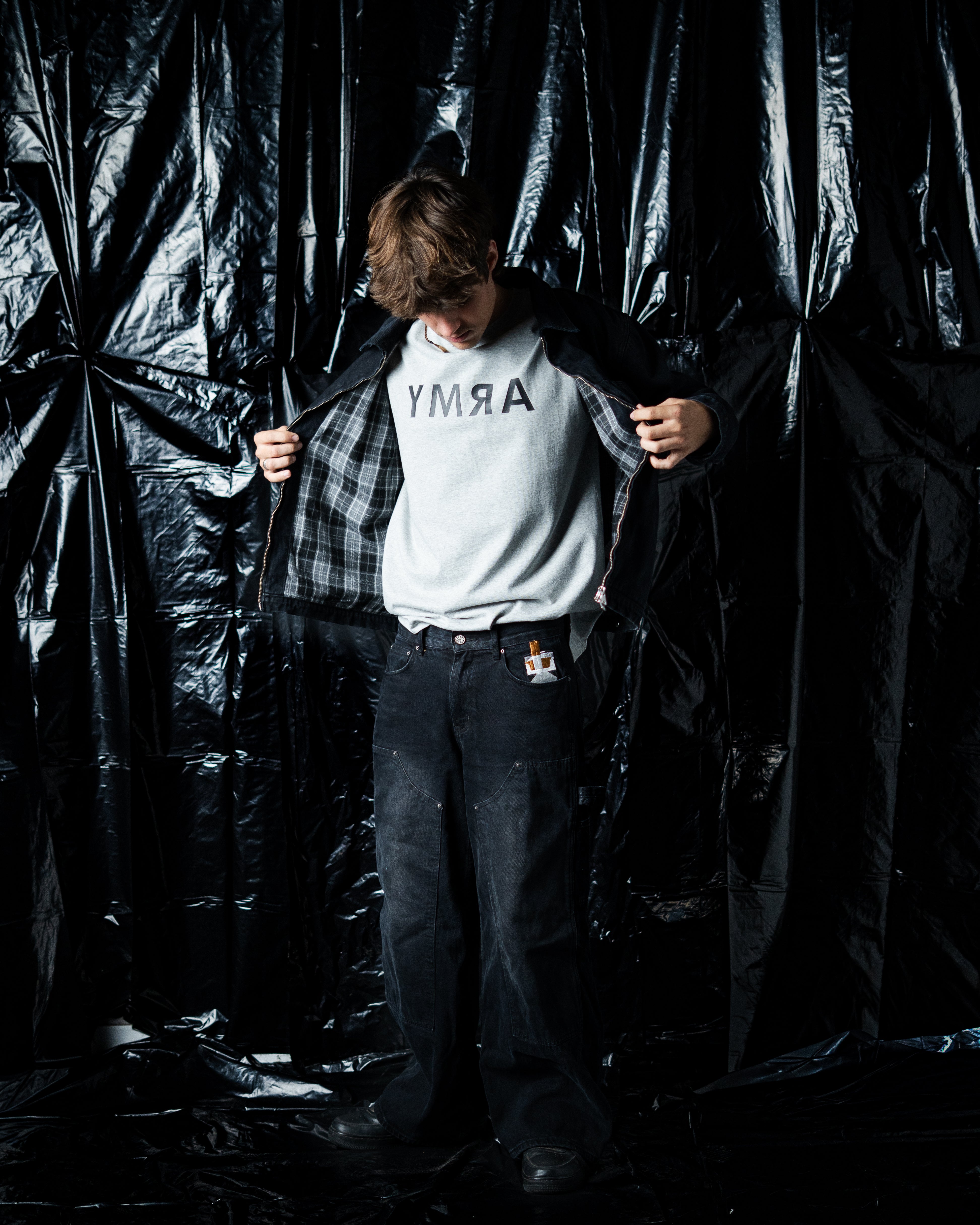 Relaxed fit denim work jacket. Features a custom embossed button and hardware, corduroy collar, front welt pocket, cigarette embroidery, and lined with black and white flannel. Made from 12oz denim, 100% cotton.