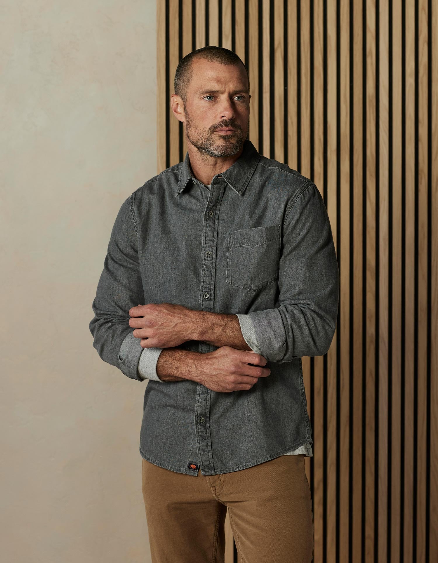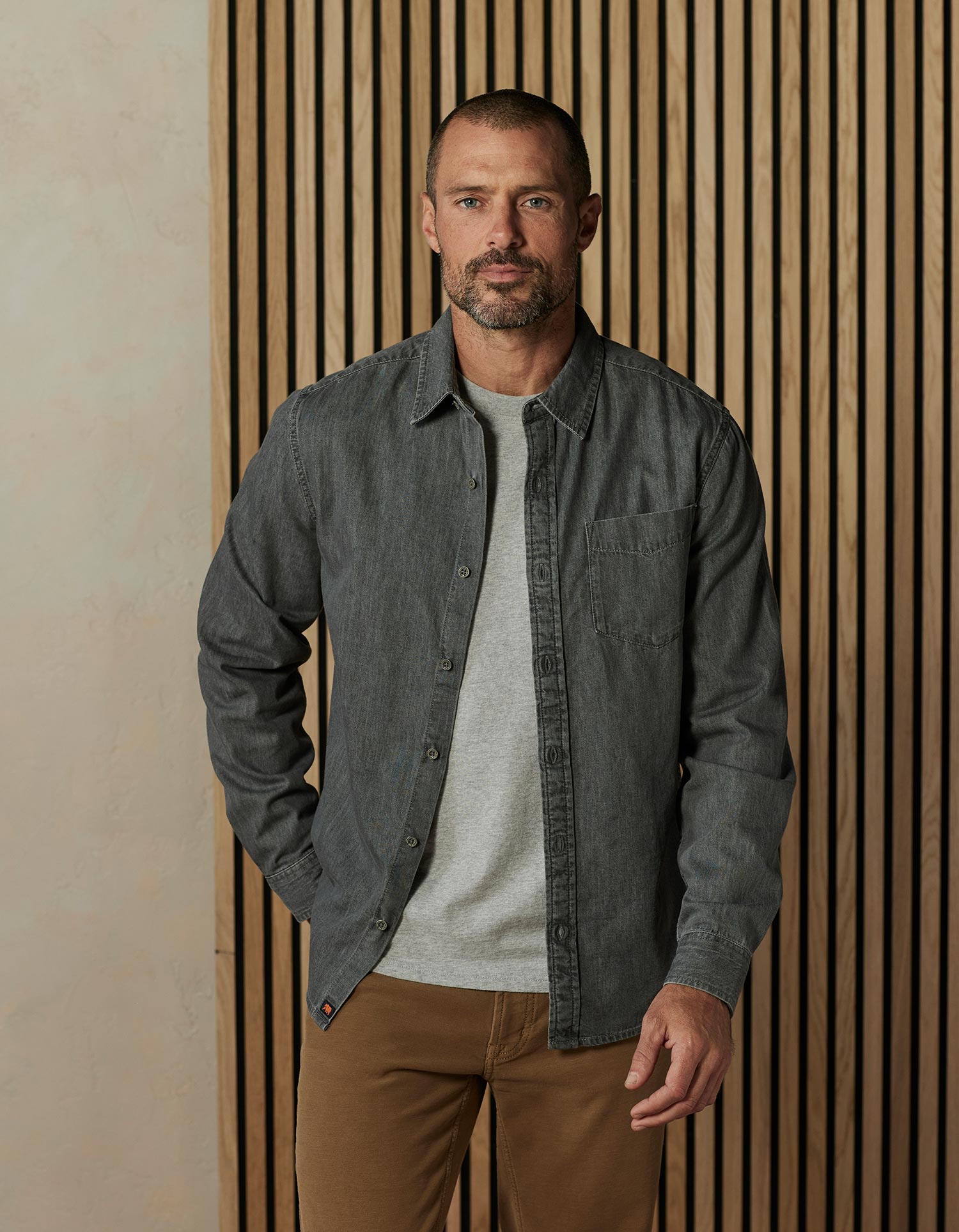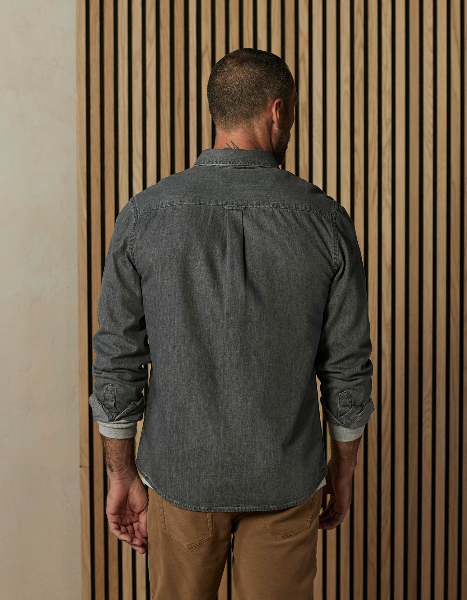 This button up is a true-to-size shirt crafted from soft, drapey Cotton denim that's as lightweight as you'd want for a Fall style. It features a 2-ply collar and collar stand, adjustable sleeve cuffs, and a single chest pocket. The back yoke with a box pleat ensures a comfortable fit, while engraved buttons add classic finishing touches.