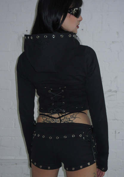 ★ Featuring lace up corset detail on back and logo embroidery on hood