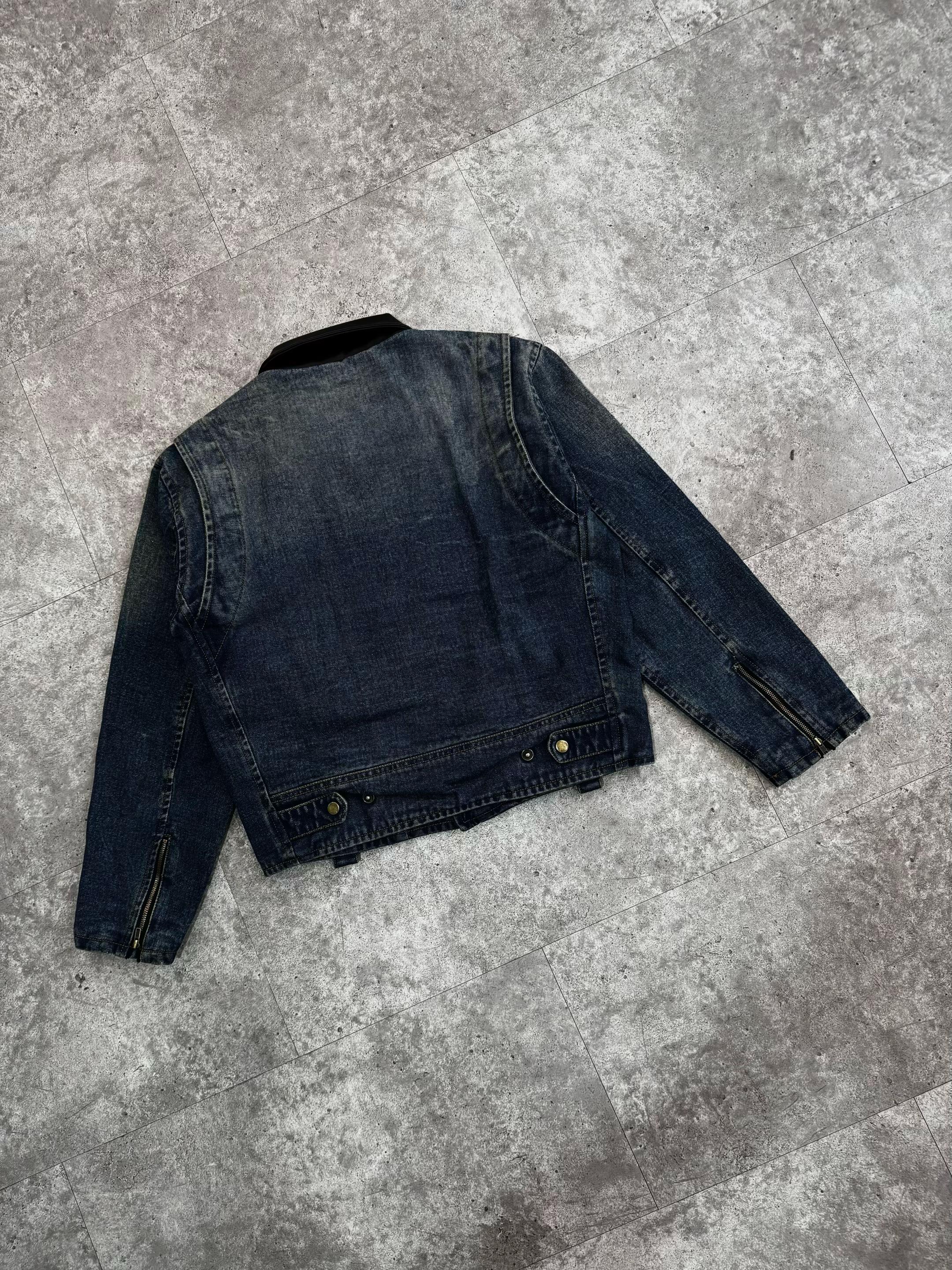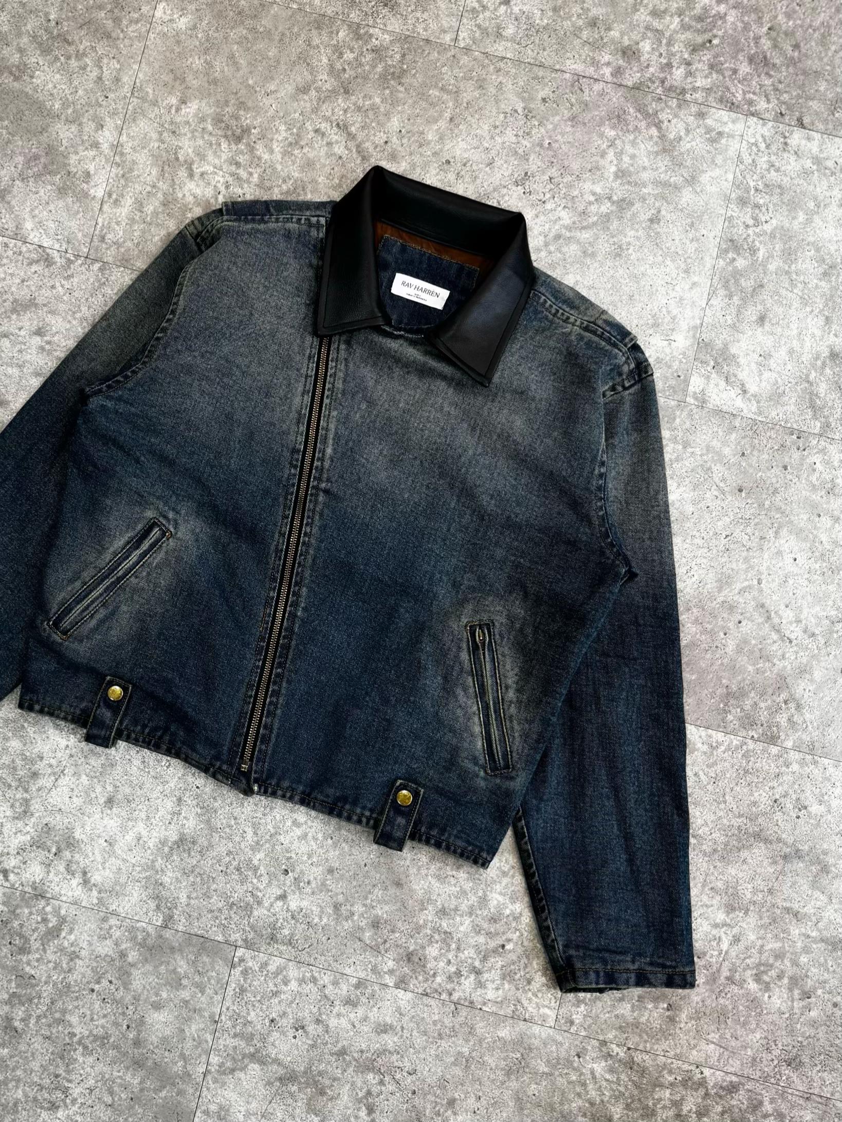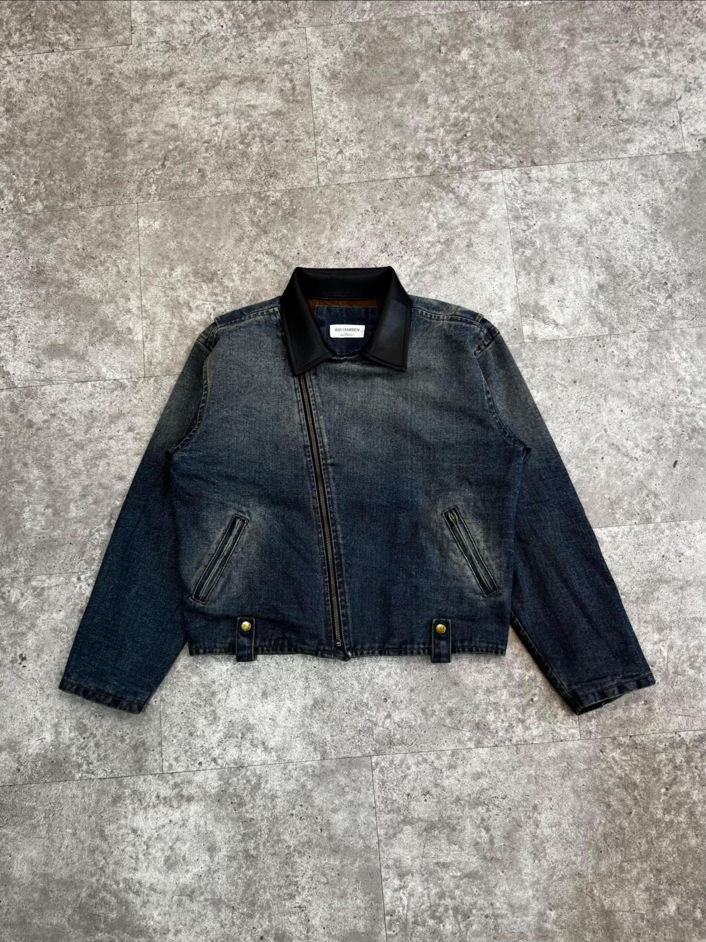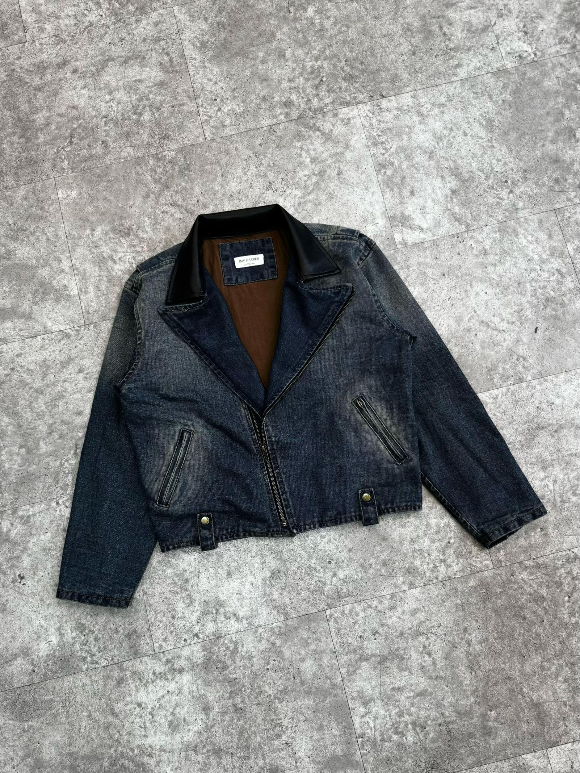 Terbuat dari 13 OZ cotton denim dengan leather collar, a modern interpretation of timeless form. YKK cross zipper accent to add edgy looks, with the boxy cropped fit to gives structure.
