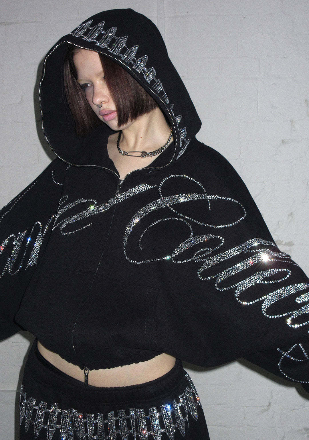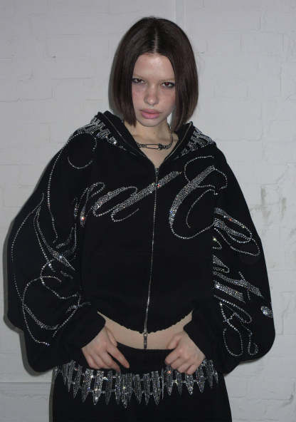 ENEMY RHINESTONE CROP ZIP HOODIE BLACK