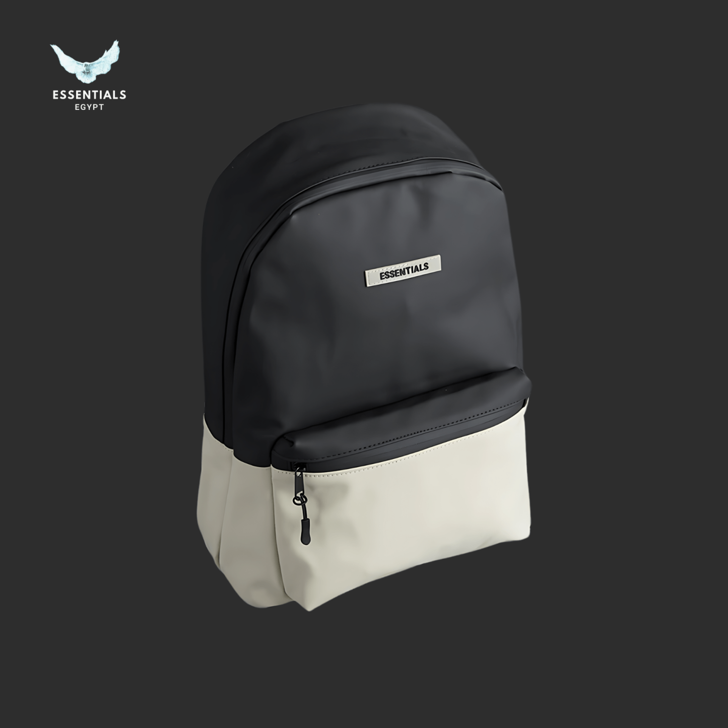 Clean creme and black colorblock backpack with Essentials branding. Minimalist and durable. Ships fast in Egypt. Dimensions: 40cm,16cm,29cm.