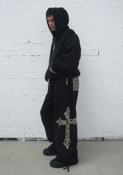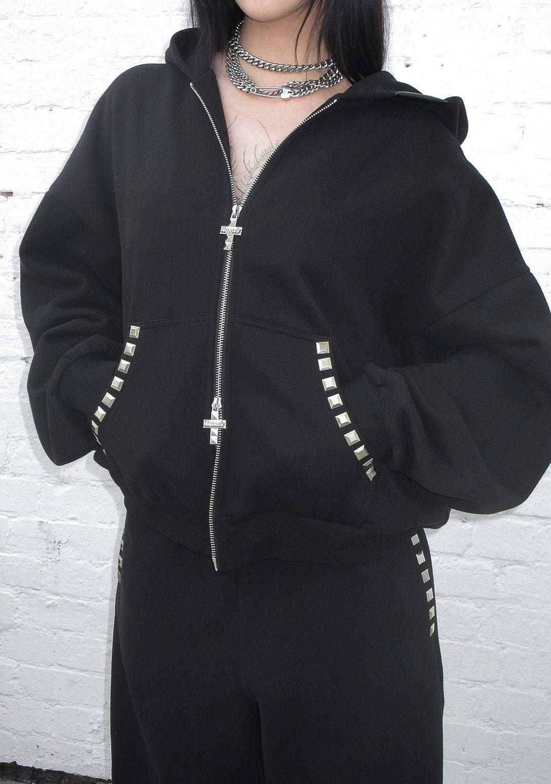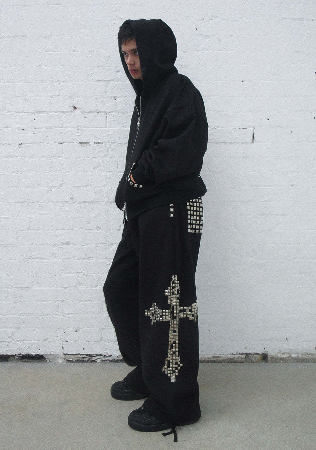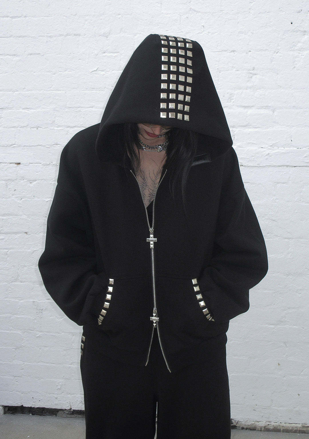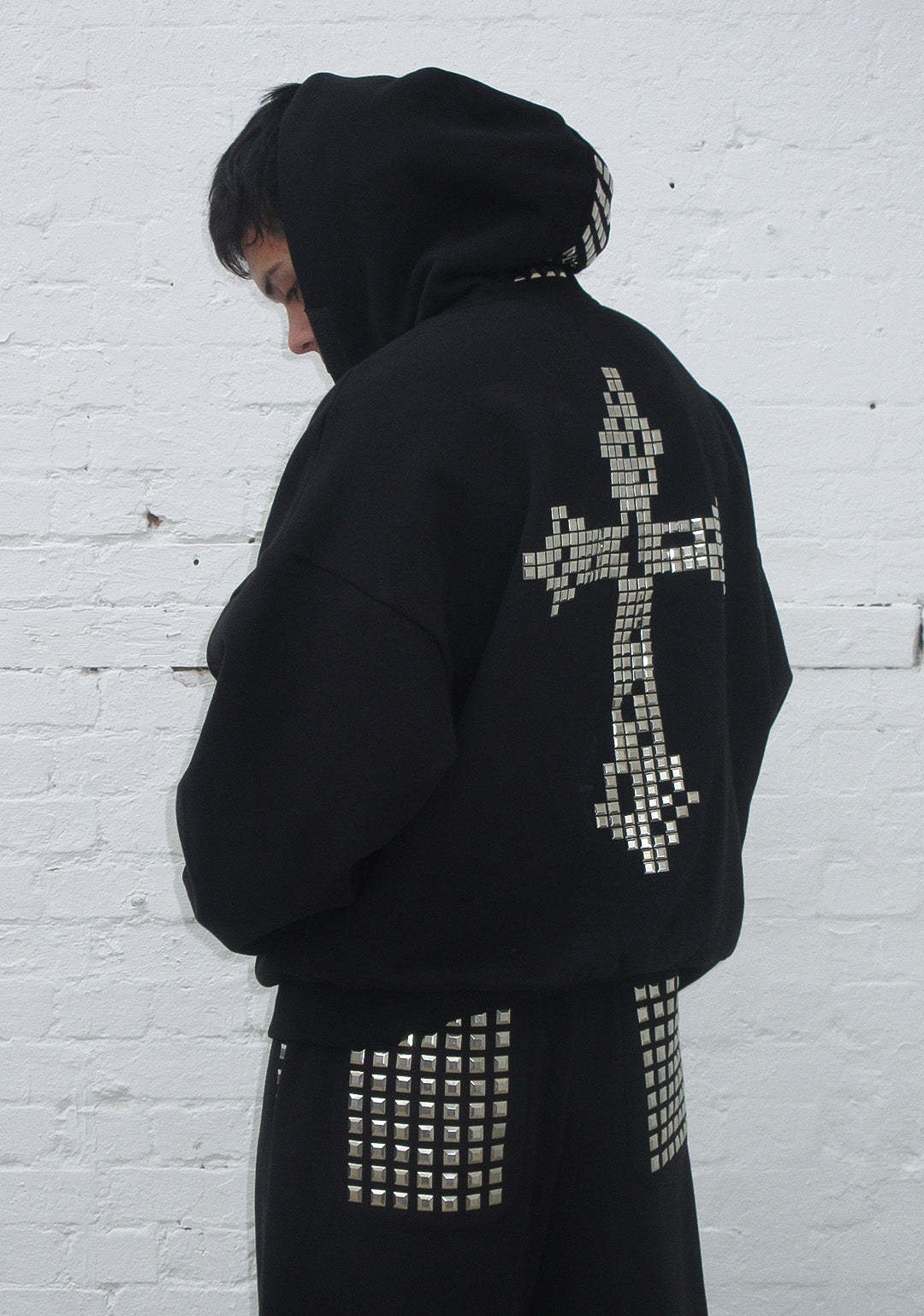 ★ Featuring chunky square studded cross design on reverse, and stud detailing across pockets and hood