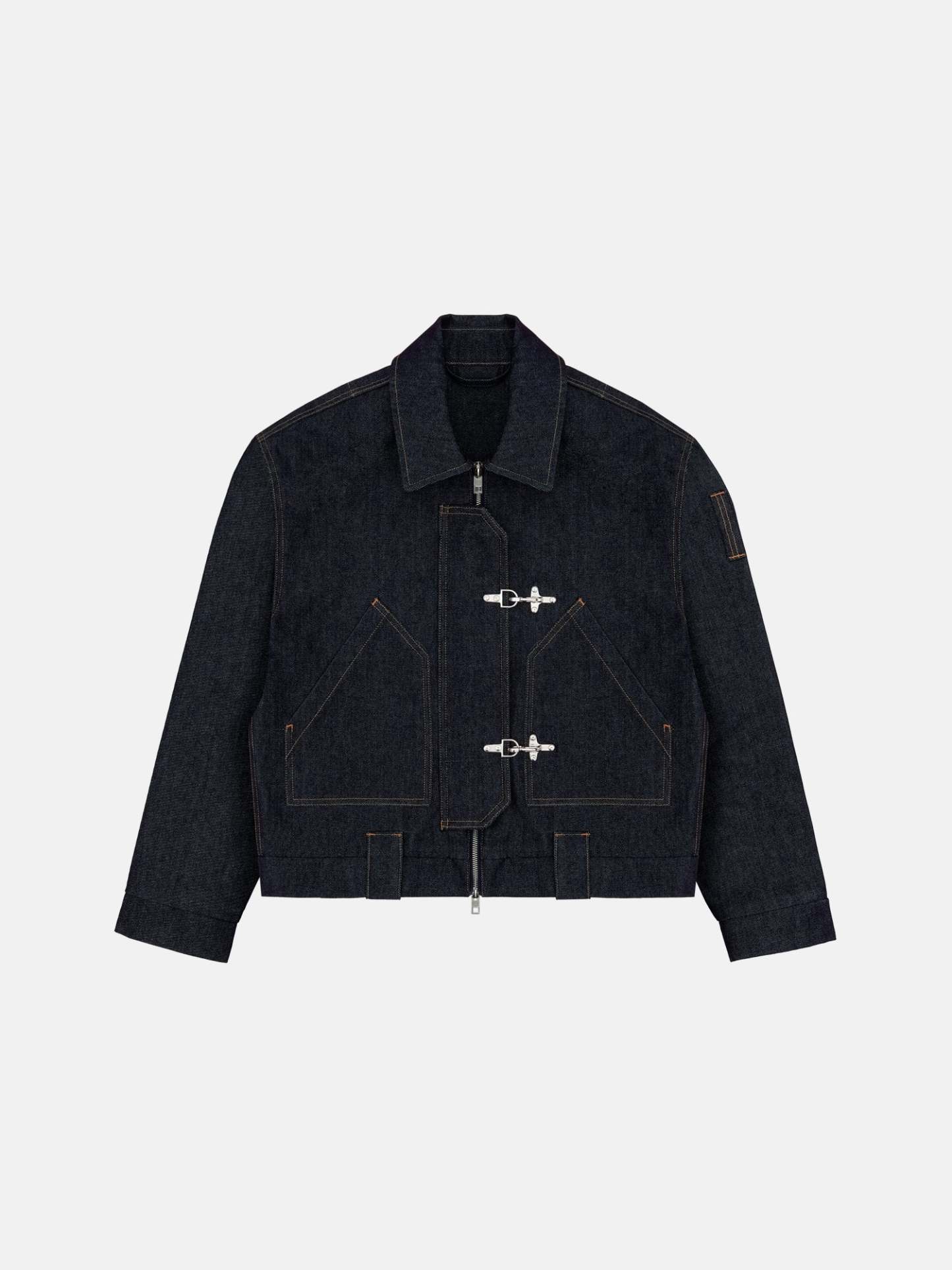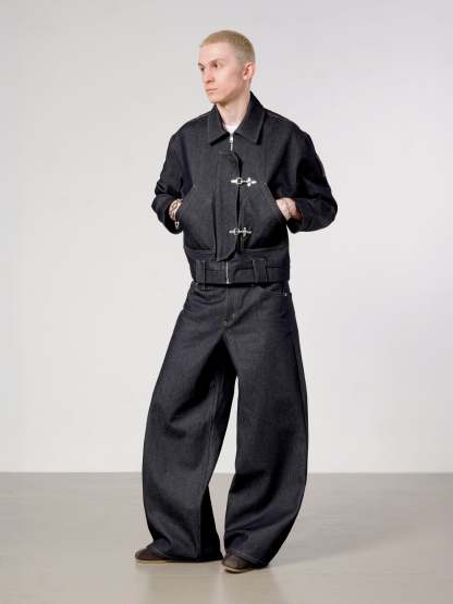 Made with raw 13,5oz 100% cotton indigo denim. Fitted with heavy-duty fireman style clasps. Boxy cut with a roomy fit ideal for spring layering. Beautifully constructed wide collar.