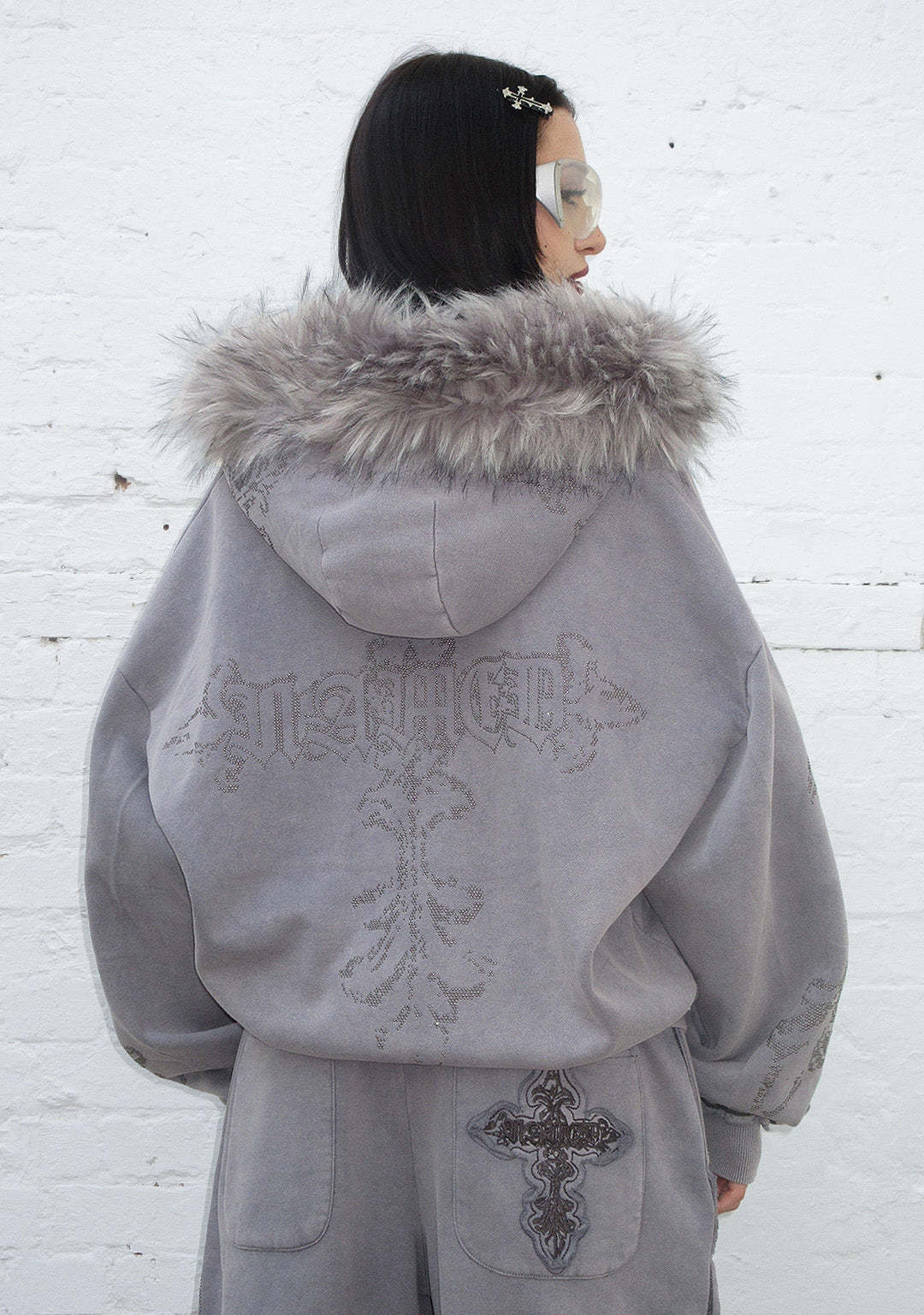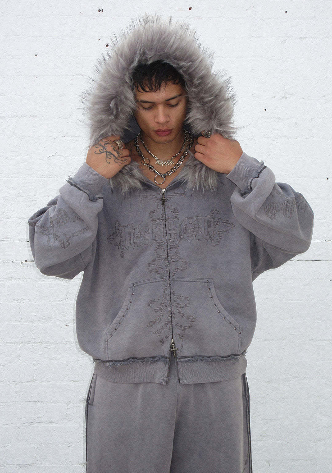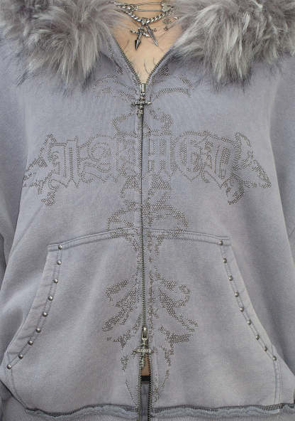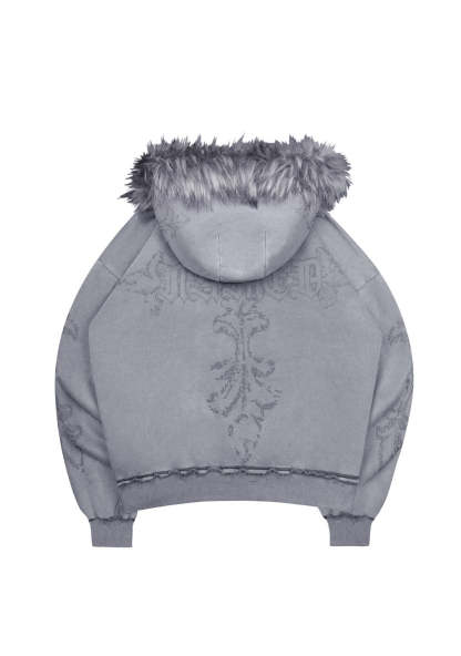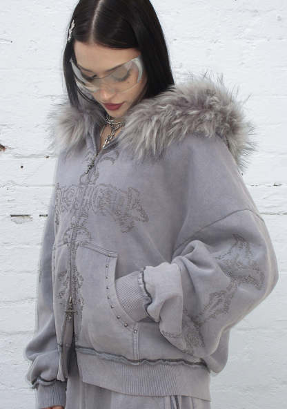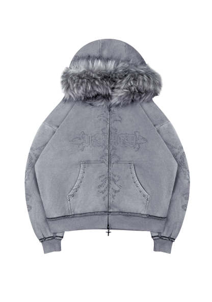 FERAL FAUX FUR STUDDED ZIP HOODIE WASHED GREY (DETACHABLE FUR)
