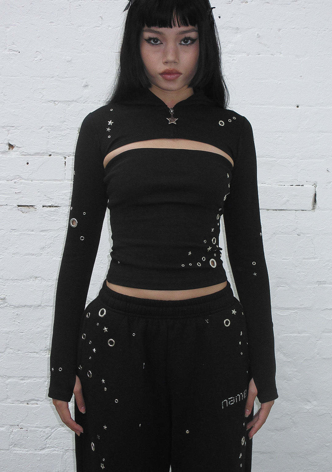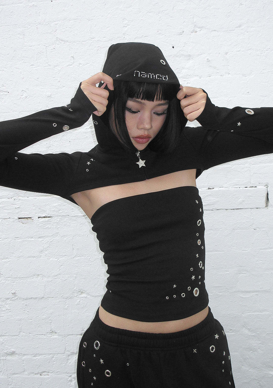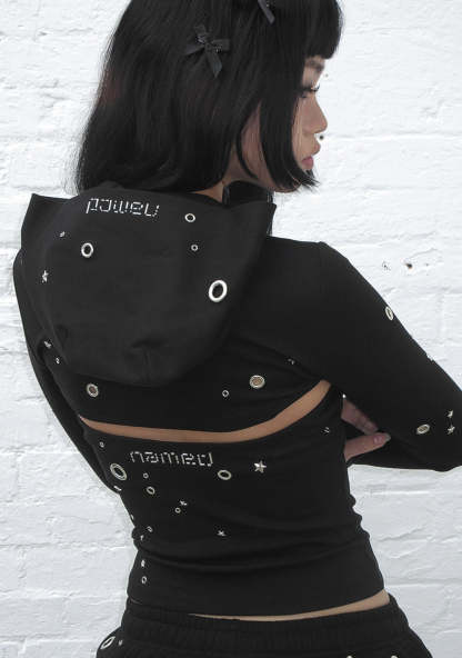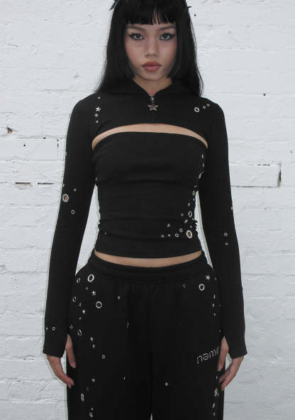 GLITCH EYELET ZIP HOODED SHRUG