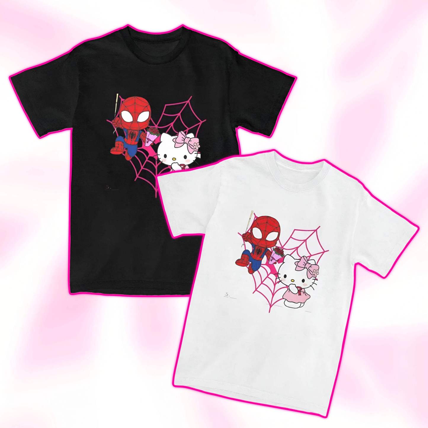 Featuring Hello Kitty and Spider-Man in a sweet heart-shaped web graphic, this tee blends kawaii charm with Marvel magic. Ideal for Marvel fans, Hello Kitty collectors, and couples who love a playful twist.