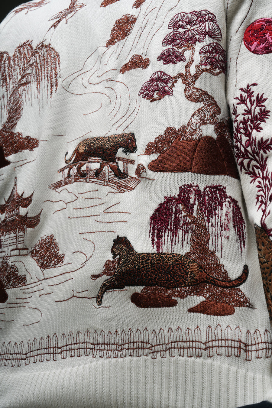 THE REFERENCES FOR THE ARTWORK IN THIS KNIT WERE TAKEN FROM ANCIENT CHINESE CHINOISERIE. IT INCLUDES BIRDS IN FLIGHT, WILLOW TREES, PAGODAS, FENCES, AND MANY OTHER BEAUTIFUL ELEMENTS.