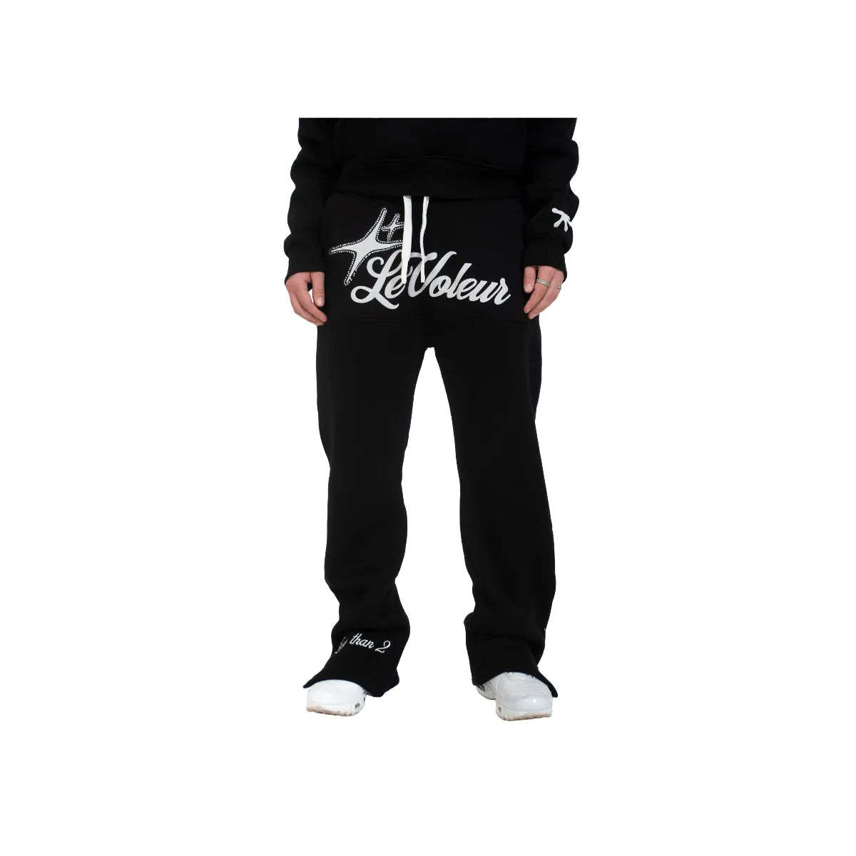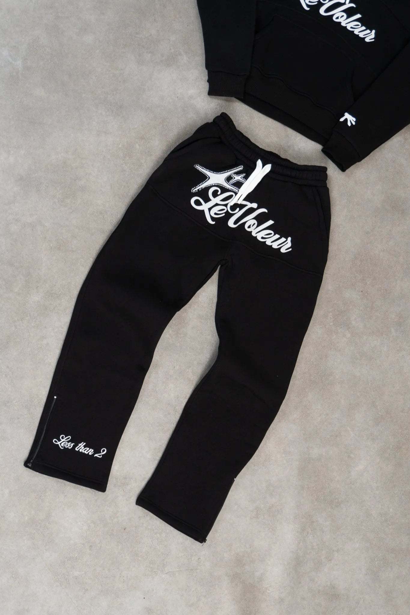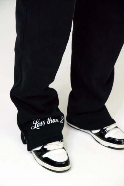"Less Than 2" stitching on the right leg