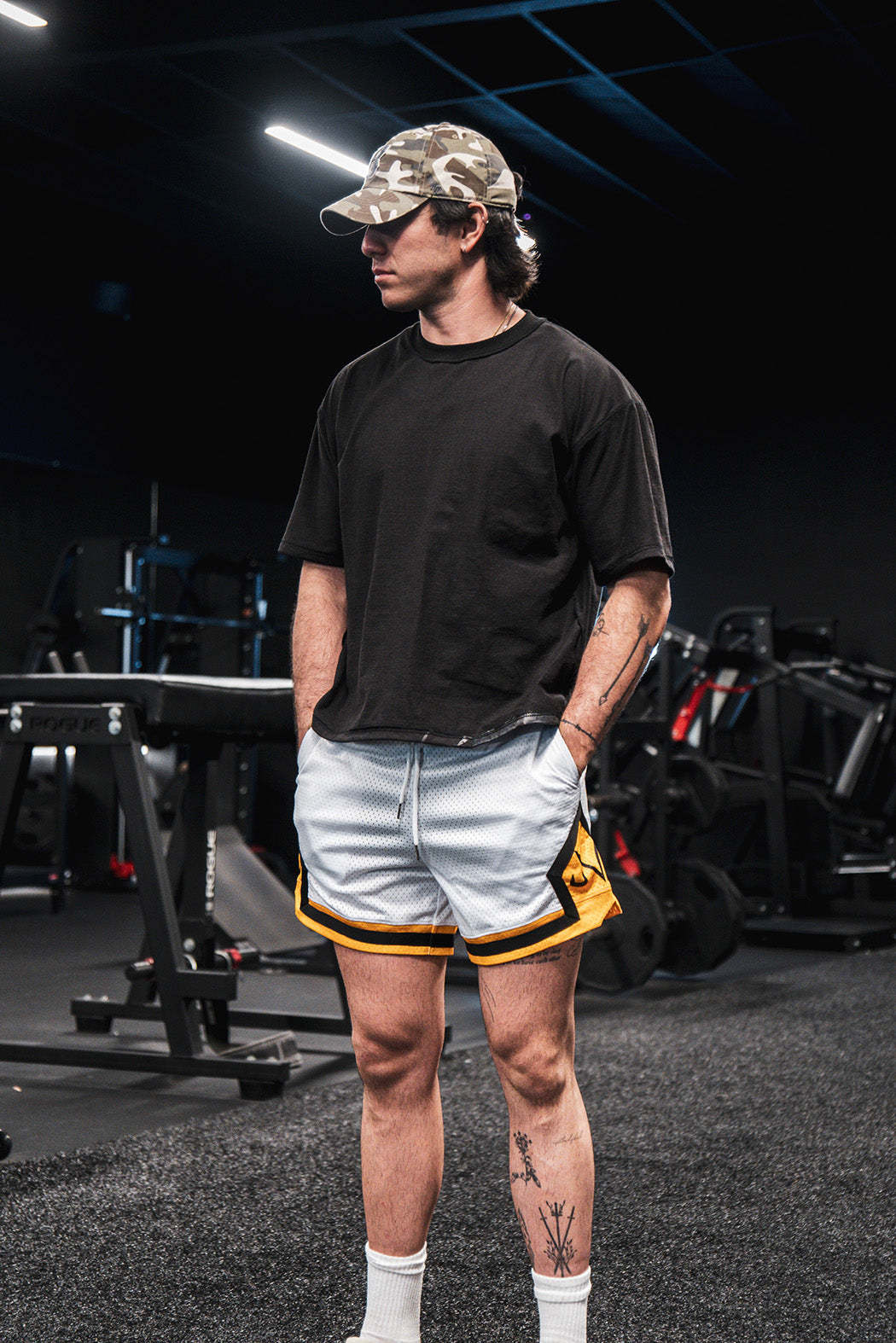 DESIGN: Striped knit tape detailing with high-quality printing and functional side pockets.