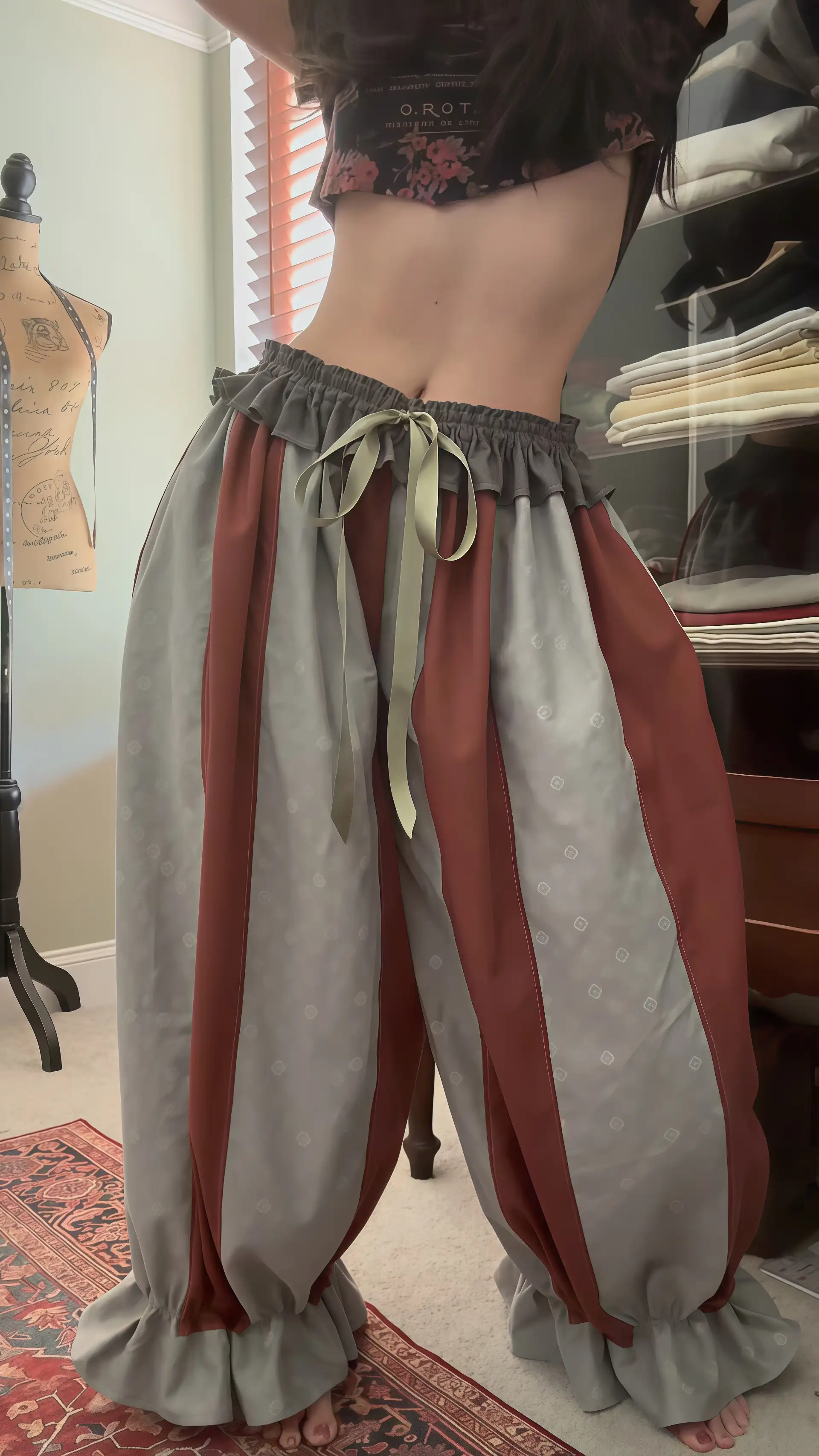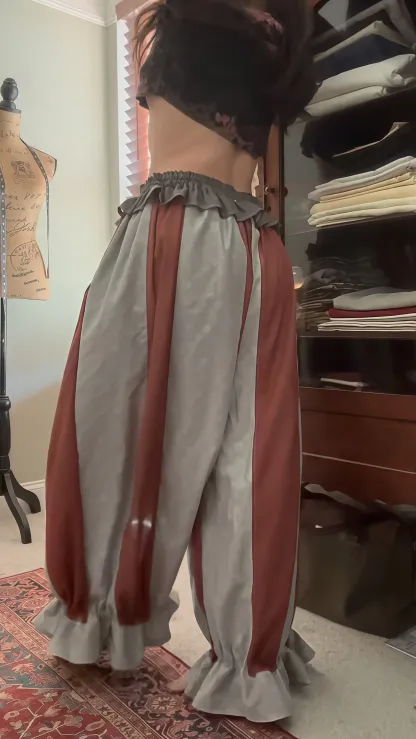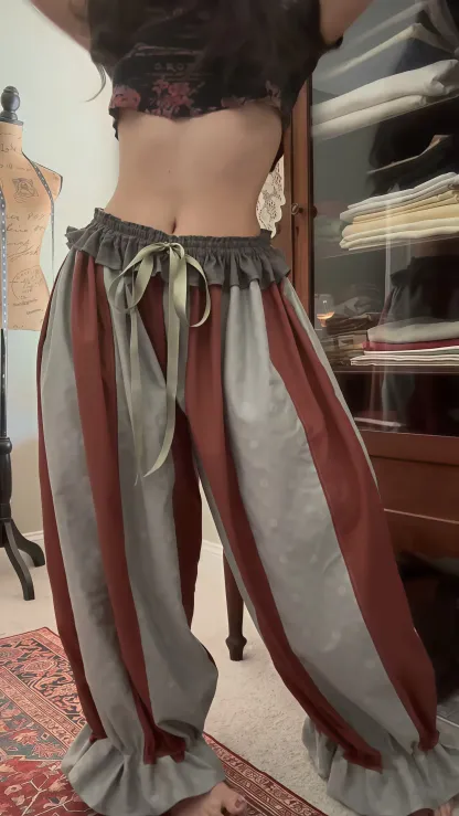 Elevate your wardrobe with these retro-inspired lantern pants that blend bold design and delicate details.
