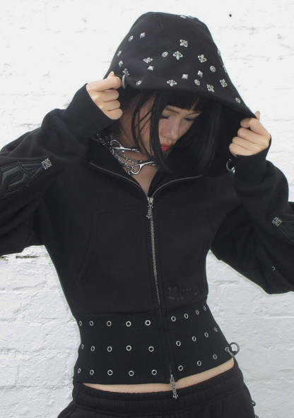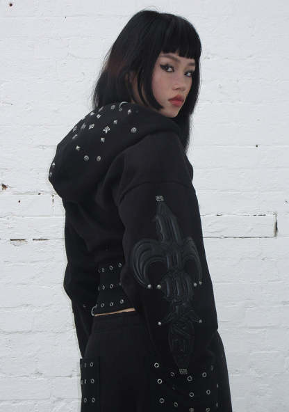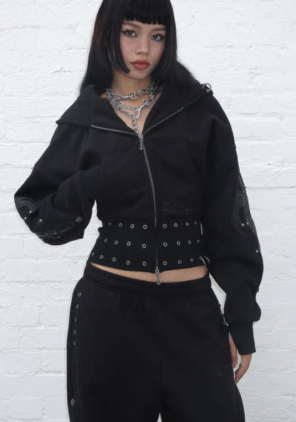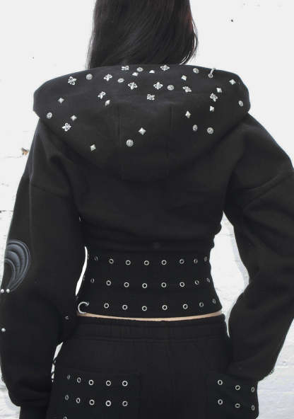 MIDNIGHT STUDDED FITTED WAIST ZIP CROP HOODIE BLACK