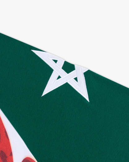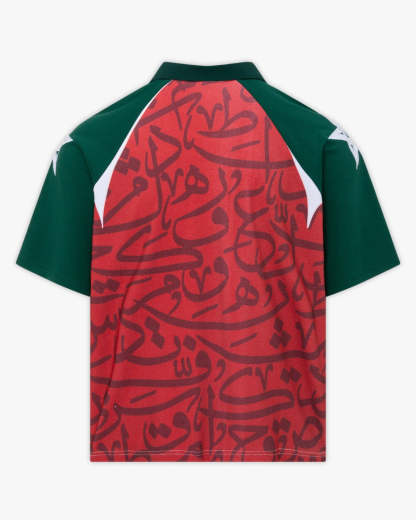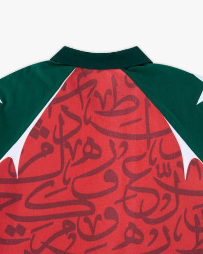 A tribute to North African heritage, the Morocco Jersey features a bold red body overlaid with flowing Arabic calligraphy and a veiled woman motif. The deep green raglan sleeves and star shoulder embroideries round off the national palette.