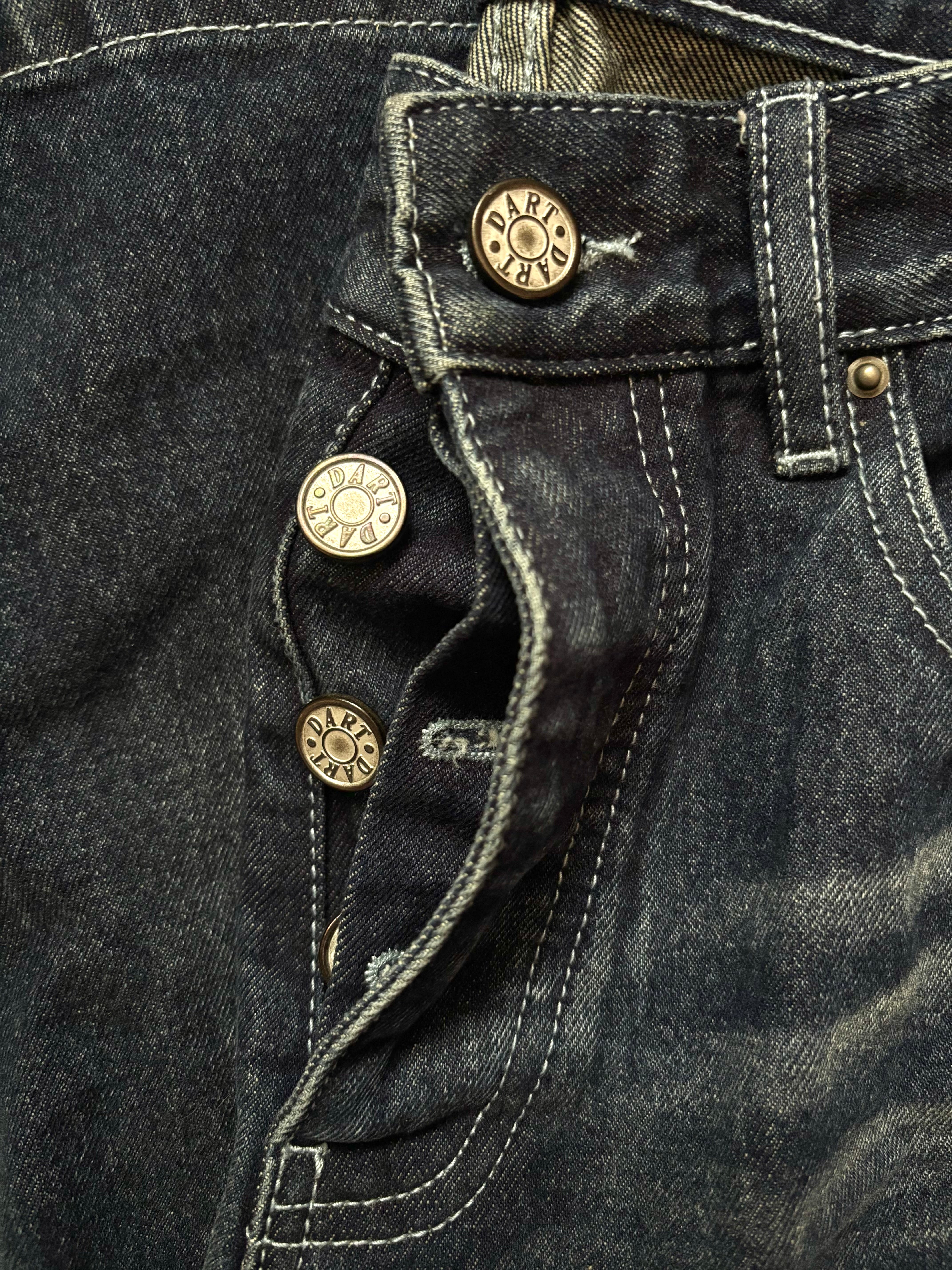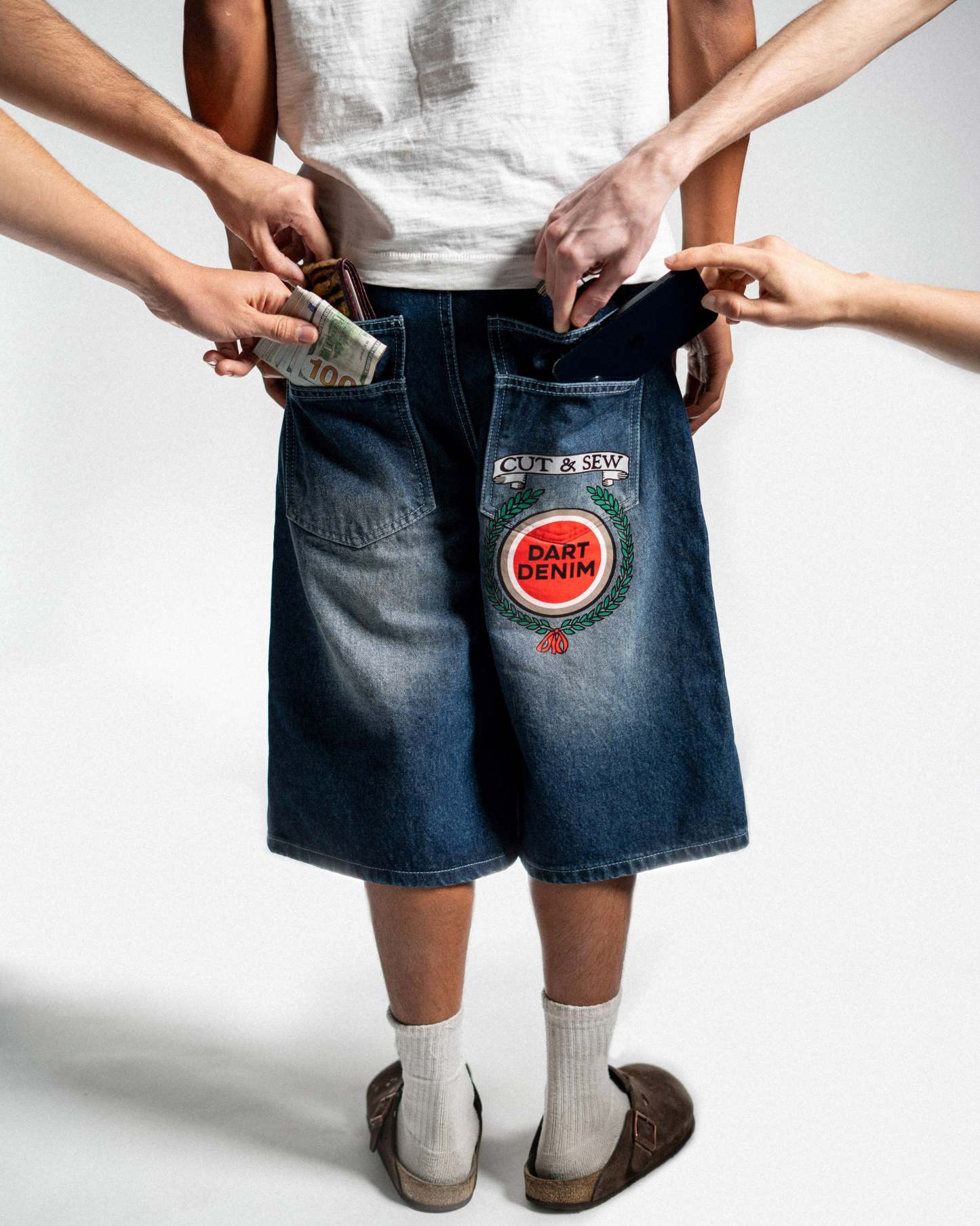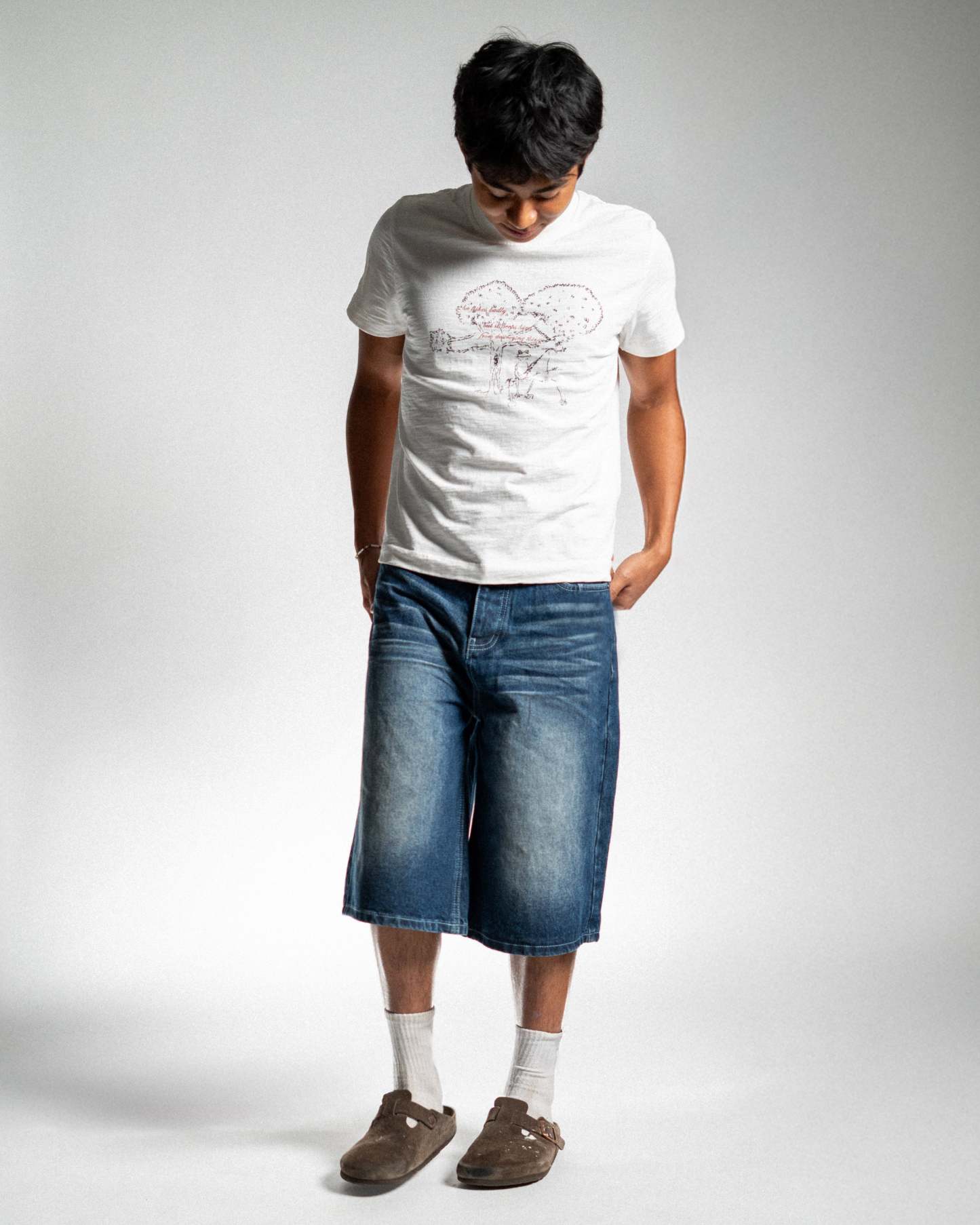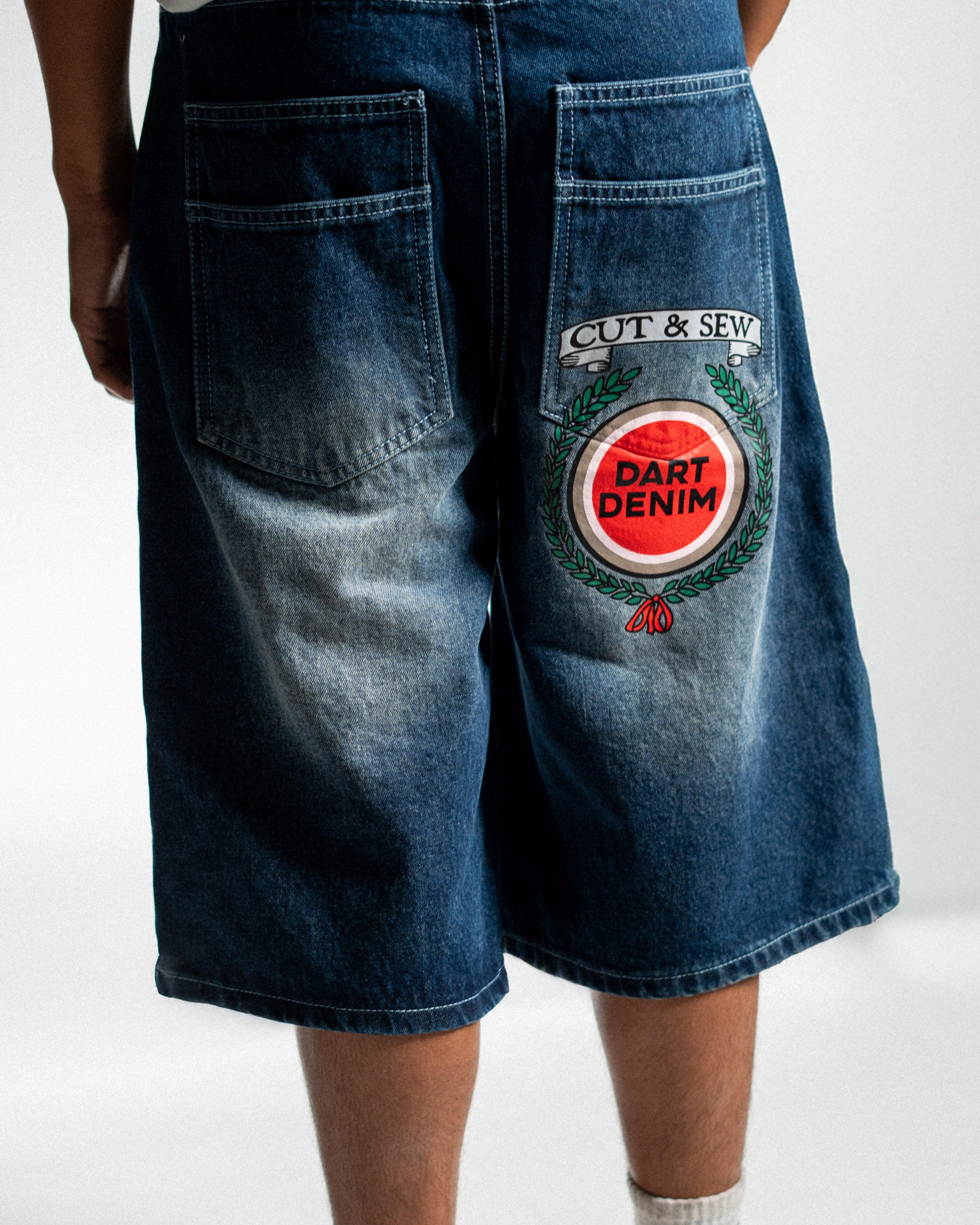Relaxed fit denim shorts. Features a custom embossed button and hardware, 2 pockets infront, 4 deep back pockets, with print on right side. Made from heavyweight denim, 100% cotton.