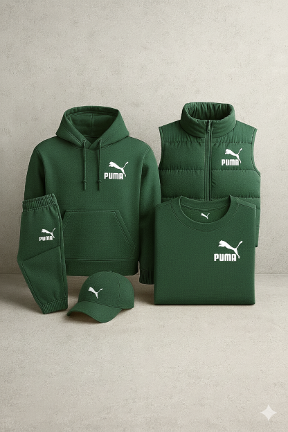 Discover the perfect balance of comfort, design, and sporty elegance with this complete Puma tracksuit Set. Comprising a hoodie, quilted vest, joggers, a t-shirt, and a matching cap, this kit embodies a modern and refined look, ideal for all seasons.