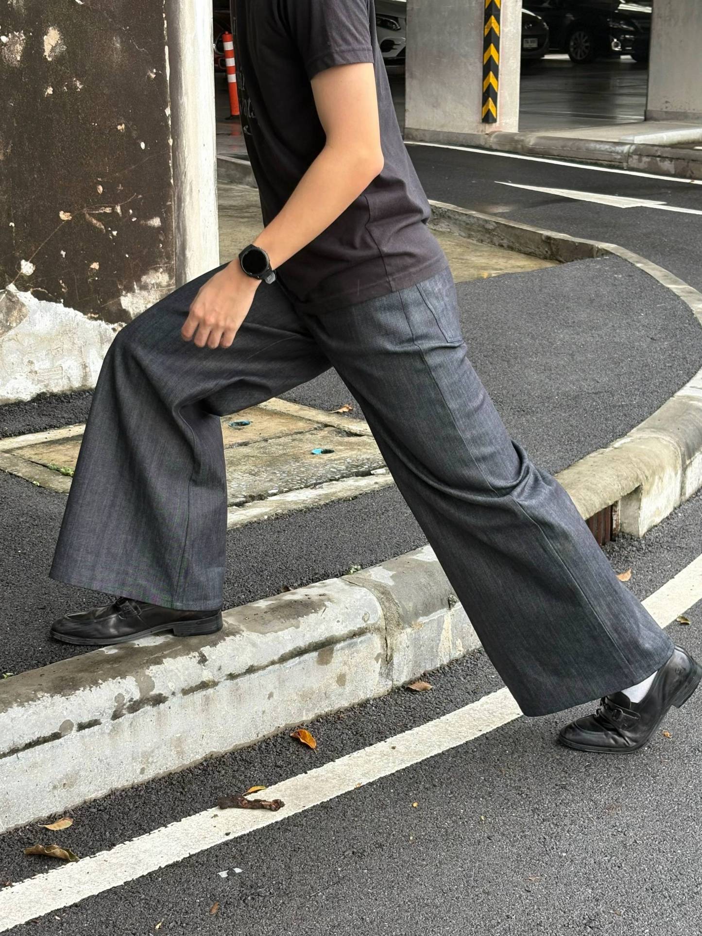 crafted from premium dark gray denim fabric. Featuring a high-waisted design, they offer a relaxed and laid-back fit that drapes beautifully, creating a trendy and avant-garde silhouette. The fabric has a subtle iridescent texture under light, adding a unique visual appeal. Suitable for pairing with simple tees or stylish shirts, these jeans effortlessly blend street style and high-fashion elements, making them a standout piece for those who pursue individualistic fashion.