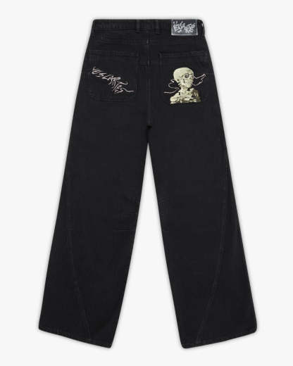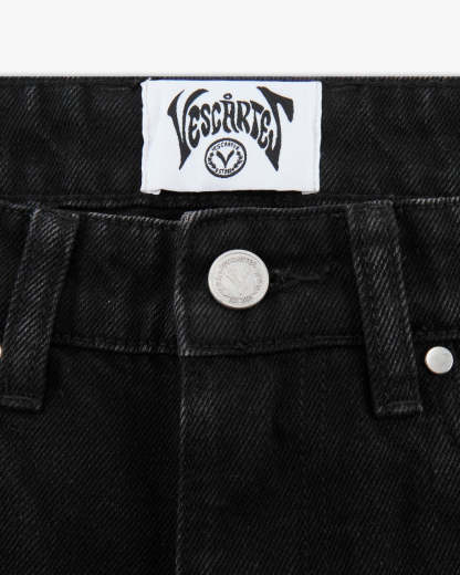 Jet-black denim subtly faded for a worn-in look. The front left pocket carries an intricate skeleton hand embroidery. The back features dual pocket embroidery inspired by Van Gogh and spells ‘Vescartes’ in the drifting smoke. Finished with custom front and back panel construction and our signature metal hardware.