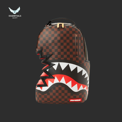 Sold-out design featuring triple shark mouth graphics on a brown check pattern. Rare drop. Dimensions: 45.7 cm × 15.2 cm × 29.2 cm.