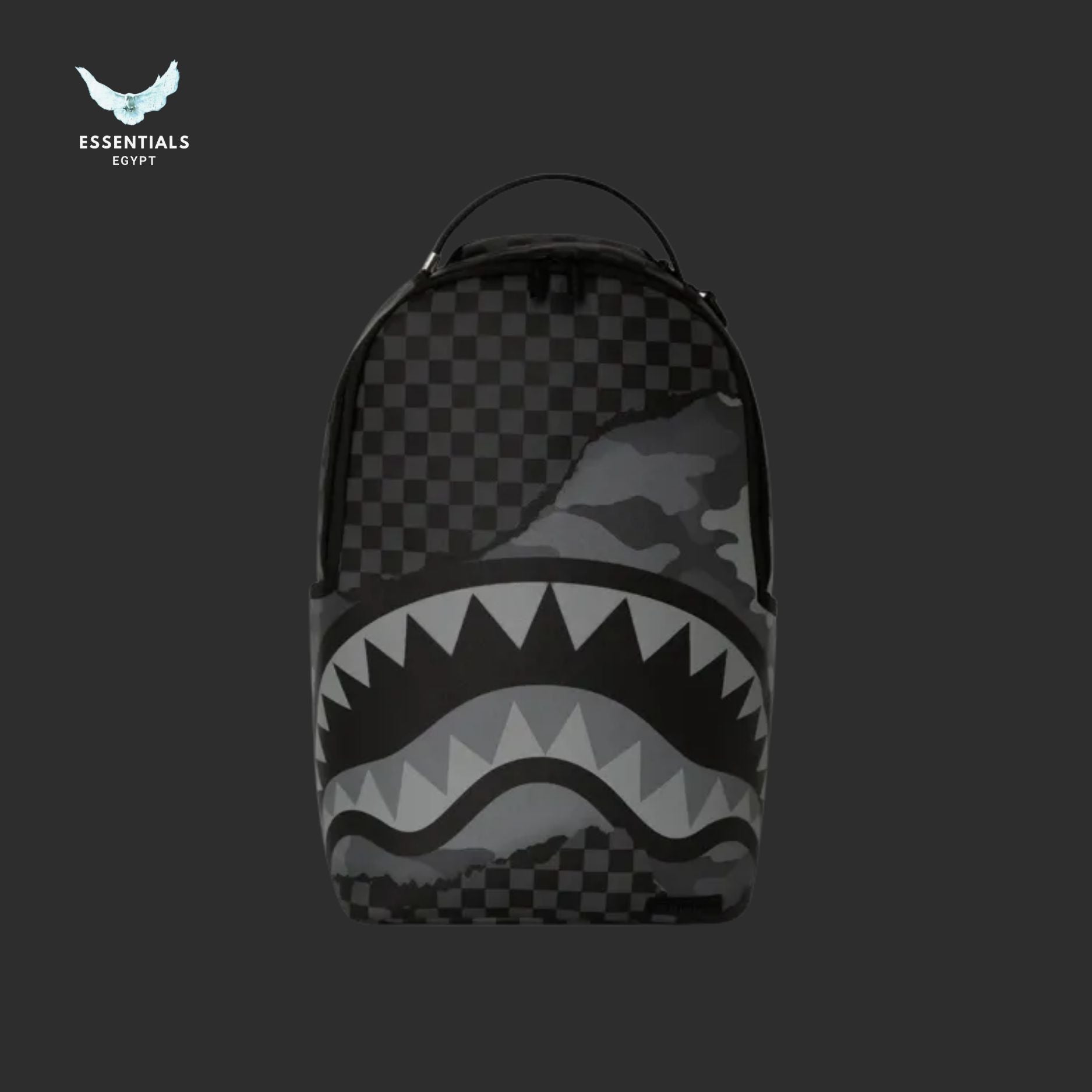 Stealth black camo backpack with signature shark mouth graphic. Durable build, 100% authentic in Egypt. Dimensions: 45.7 cm × 15.2 cm × 29.2 cm.