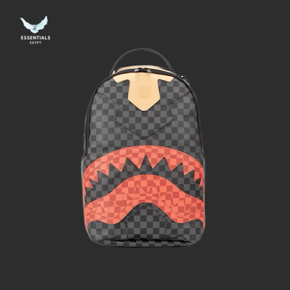 Sprayground stealth black camo backpack with shark mouth print. A must-have for streetwear lovers in Egypt. 100% authentic. Dimensions: 45.7 cm × 15.2 cm × 29.2 cm.