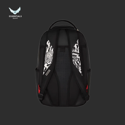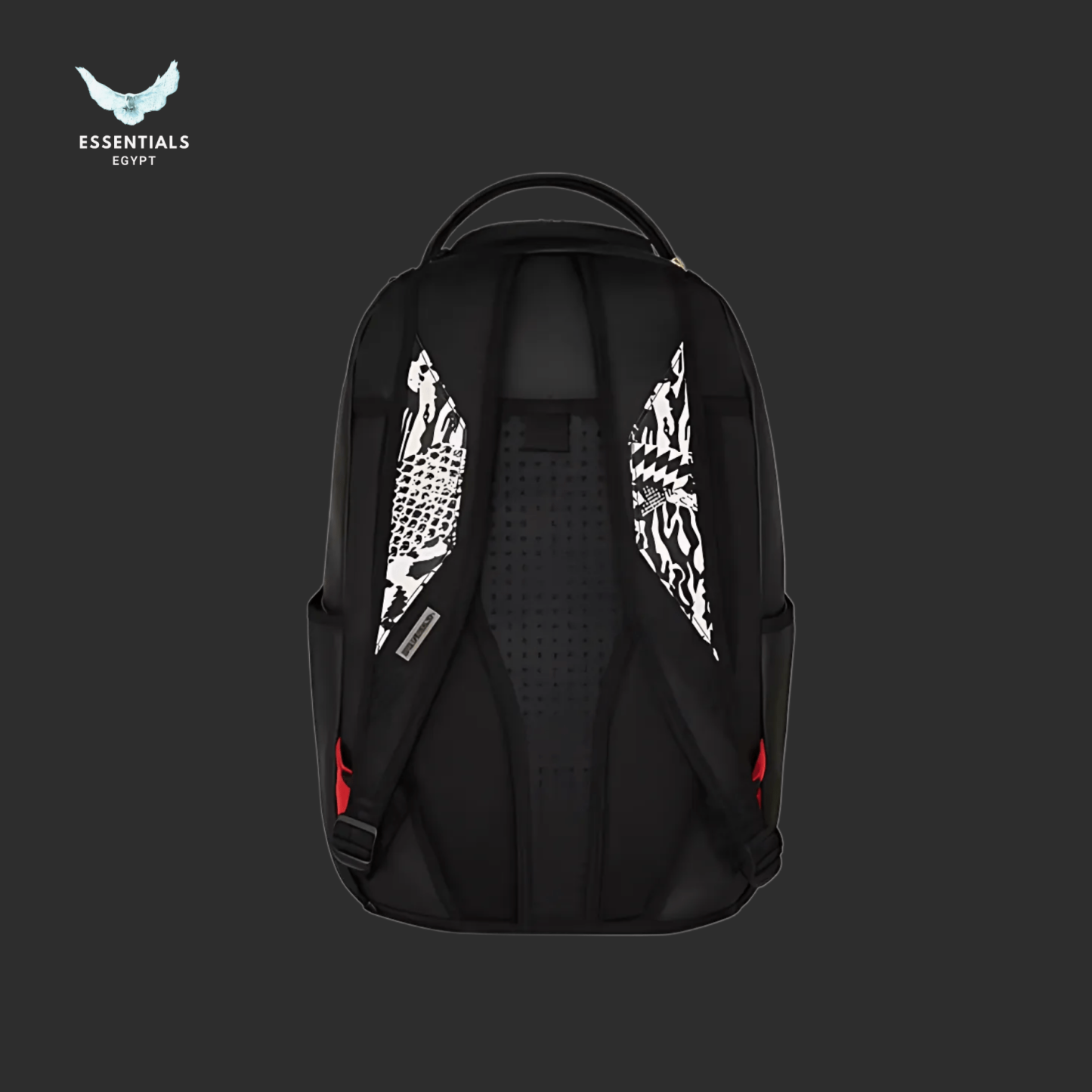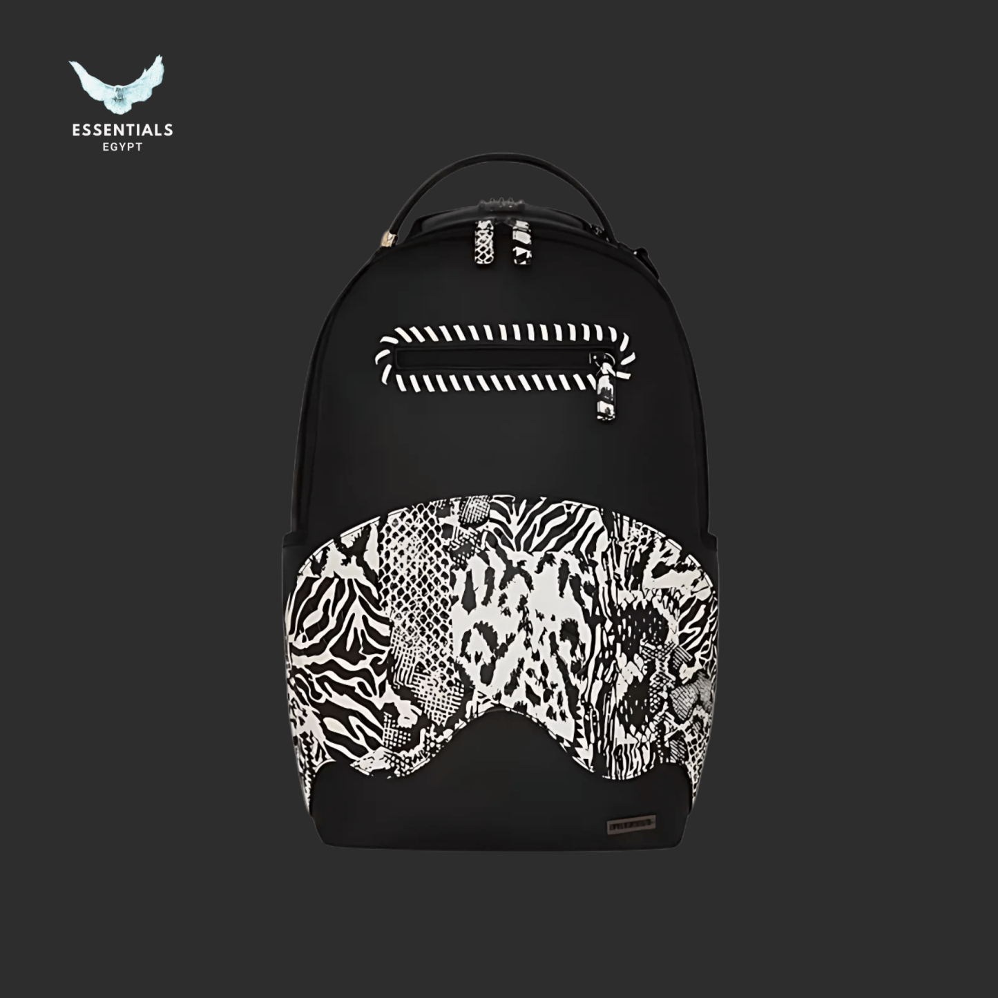 Black backpack with bold white jungle print and shark-mouth graphic. Eye-catching streetwear style. Egypt delivery available. Dimensions: 45.7 cm × 15.2 cm × 29.2 cm.