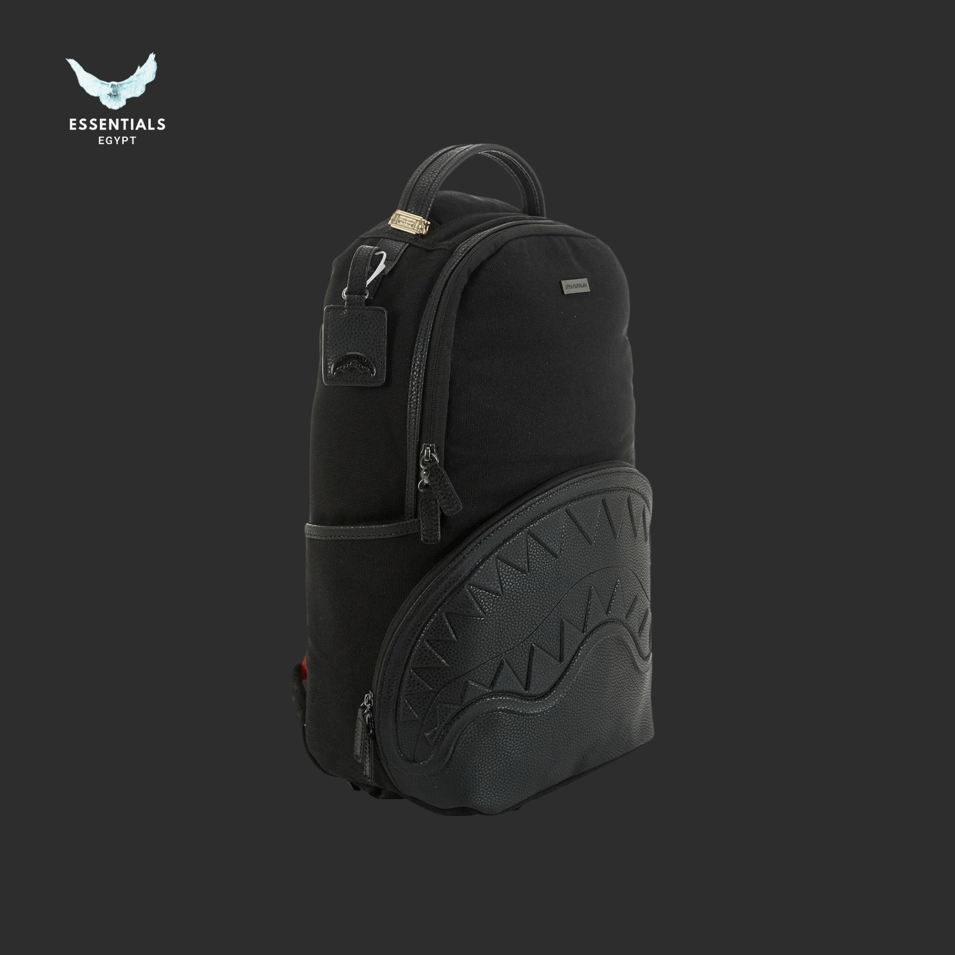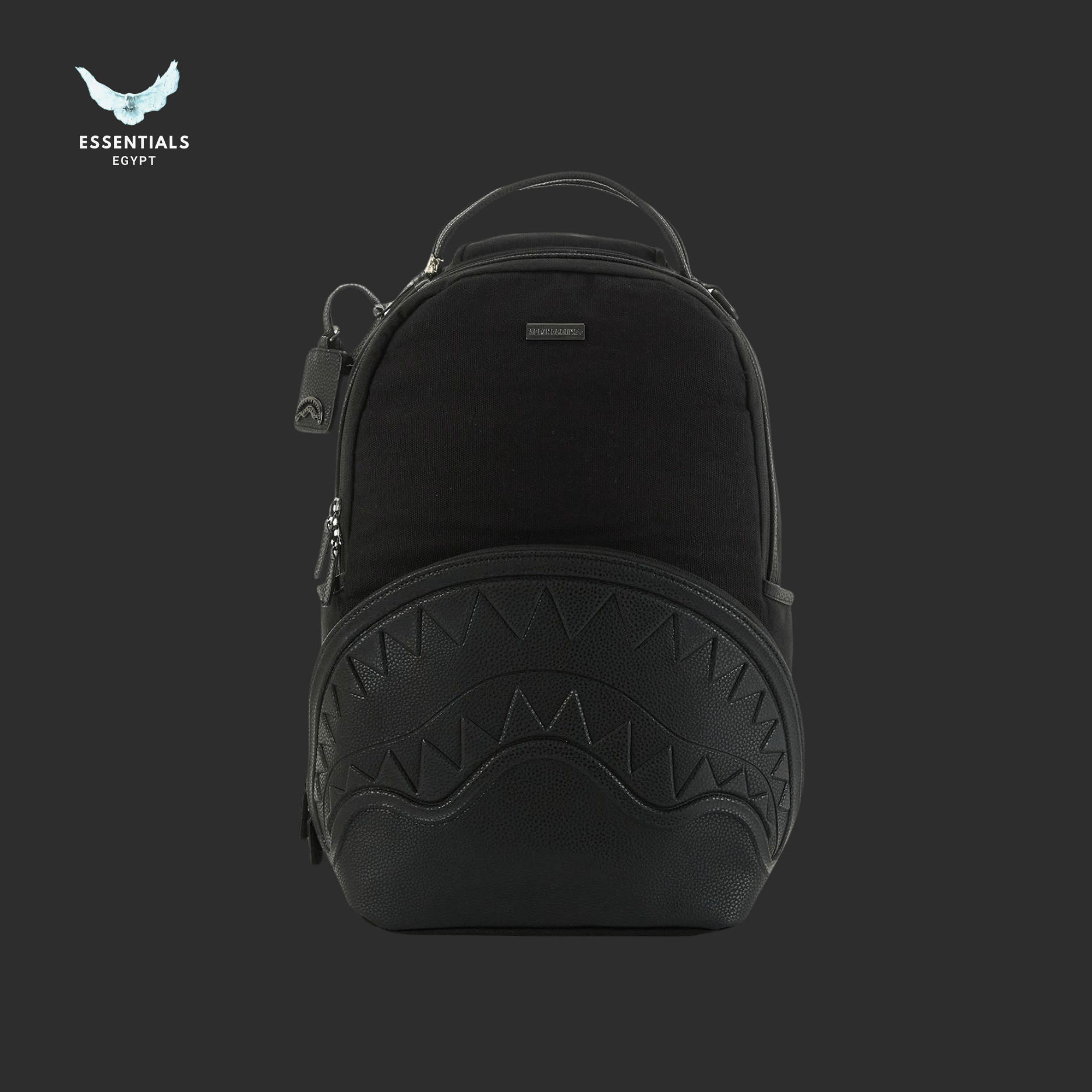 All-black shark-mouth backpack with subtle embossed details. Minimal yet iconic Sprayground look. Egypt delivery available. Dimensions: 45.7 cm × 15.2 cm × 29.2 cm.