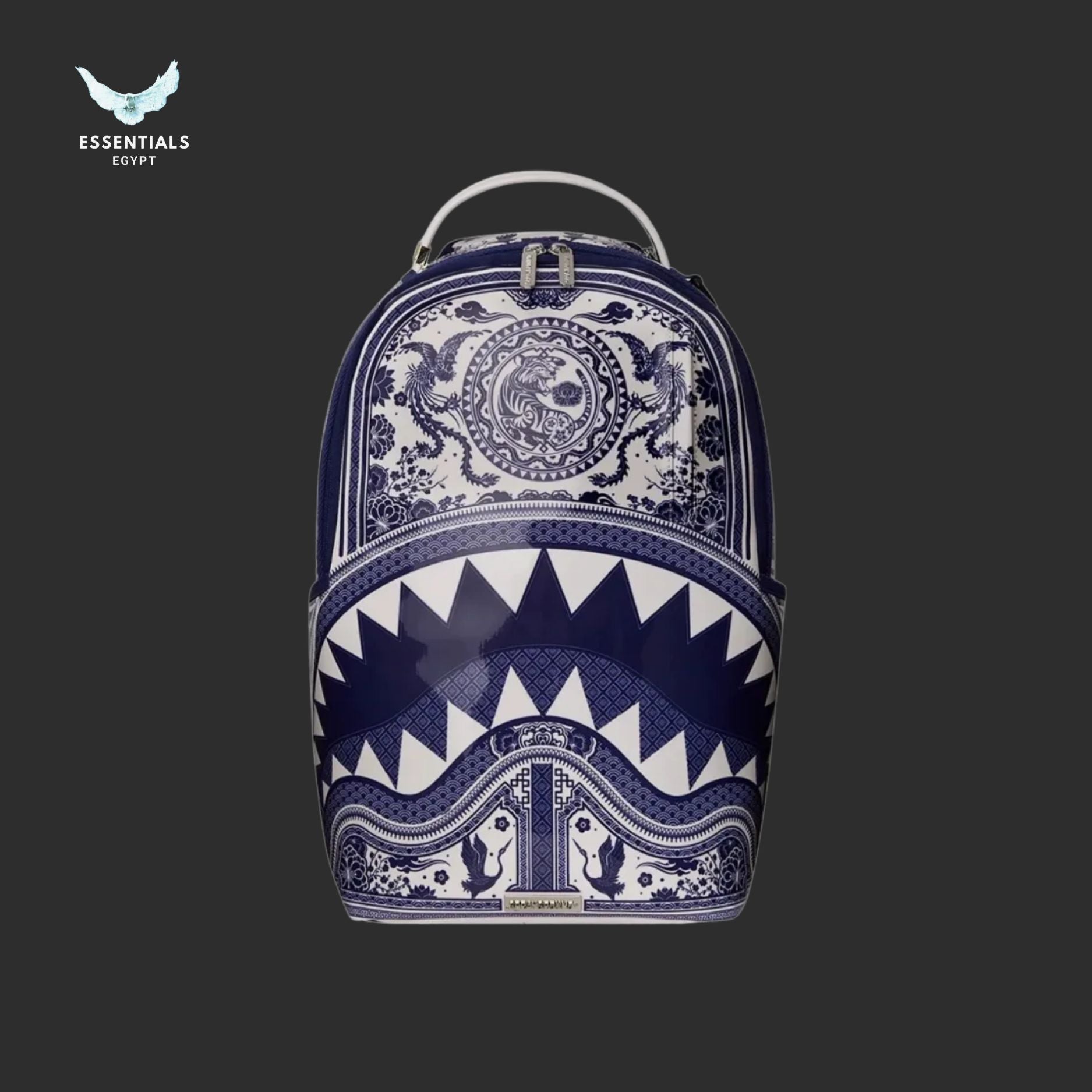 Blue and white Greek key design backpack with shark mouth print. 100% authentic in Egypt. Dimensions: 45.7 cm × 15.2 cm × 29.2 cm.