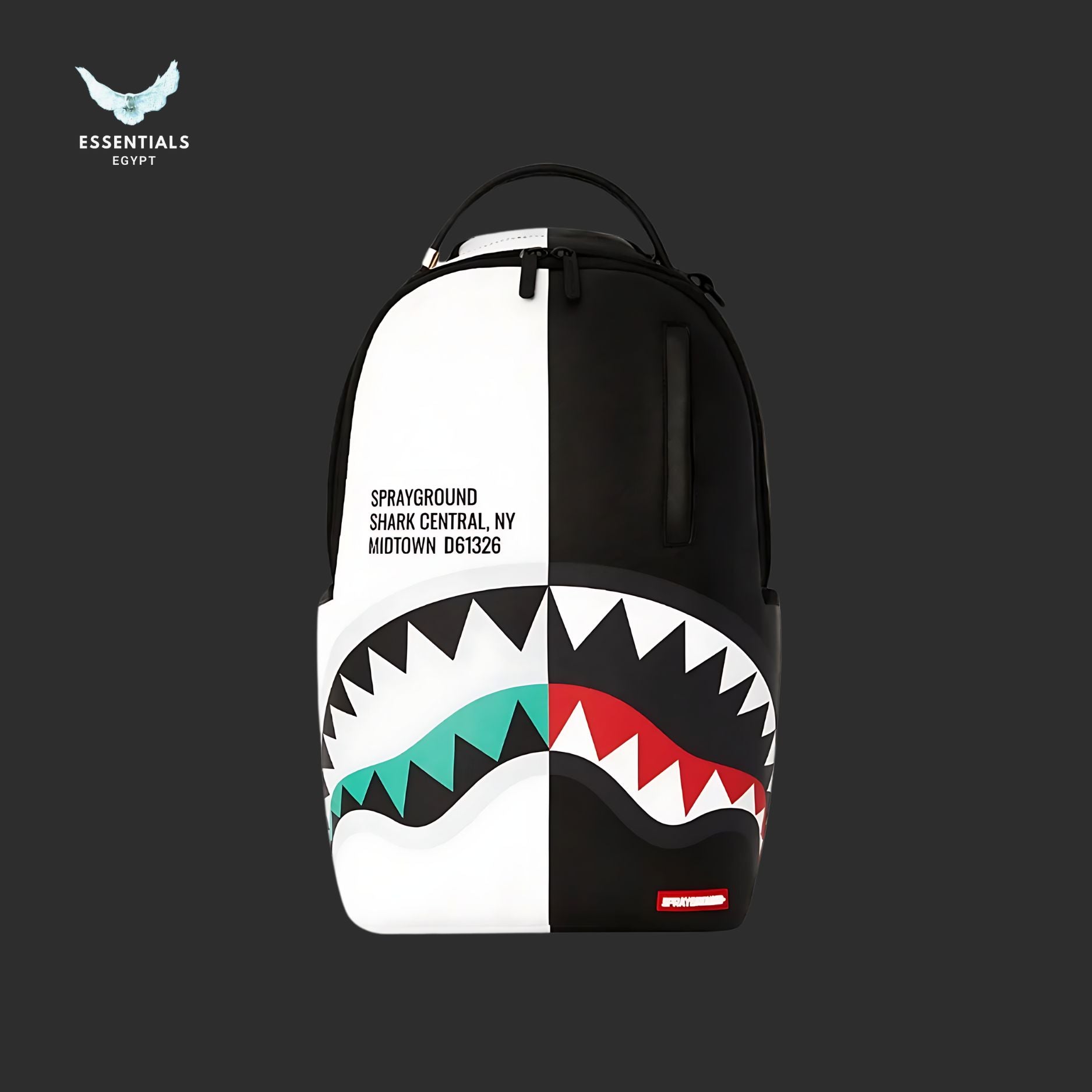 Half-white, half-black design with red shark teeth. Central NY drop. Dimensions: 45.7 cm × 15.2 cm × 29.2 cm.