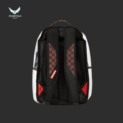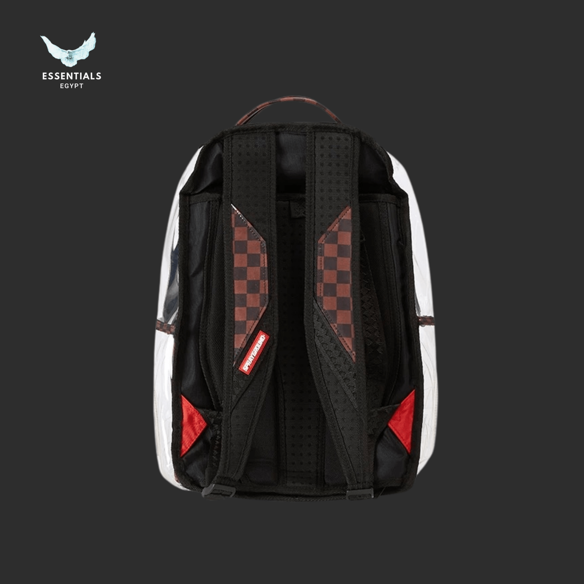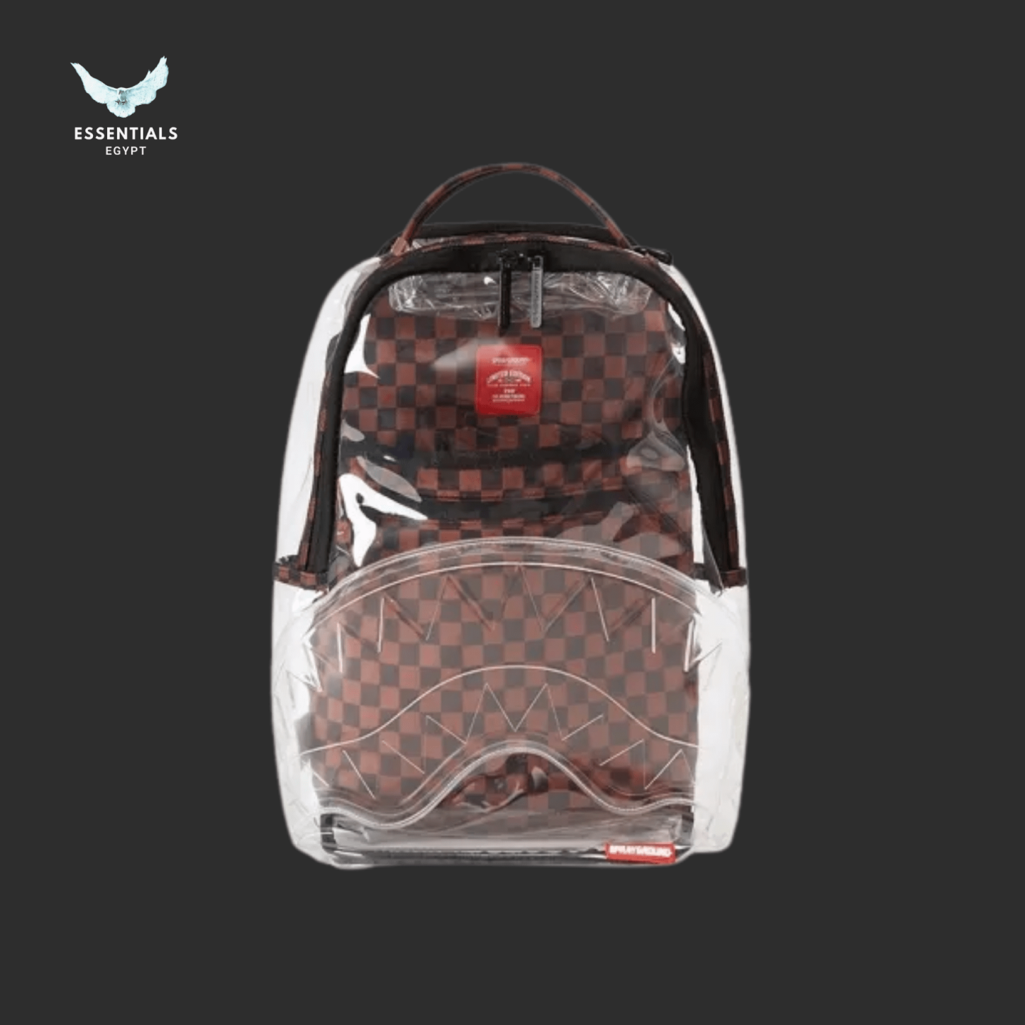 Transparent shell over brown checkered shark print. Unique Sprayground style with premium build. Egypt delivery available. Dimensions: 45.7 cm × 15.2 cm × 29.2 cm.