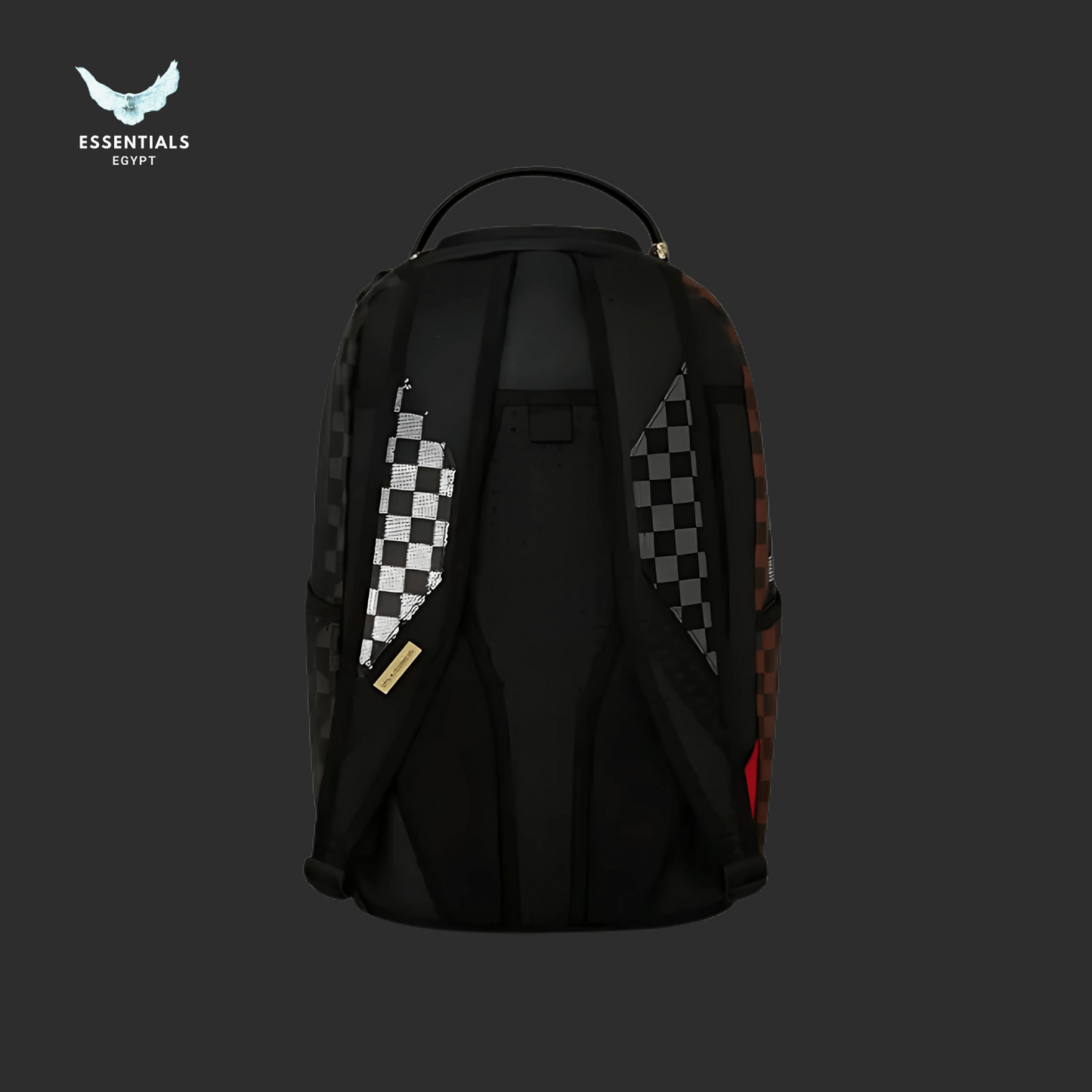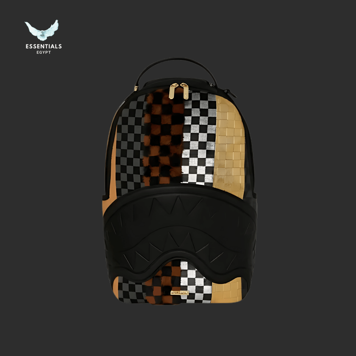 Premium Sprayground backpack with bold shark mouth and gold checker design. Spacious, durable, and 100% authentic. Delivery across Egypt. Dimensions: 45.7 cm × 15.2 cm × 29.2 cm.