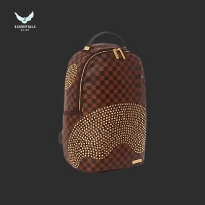 Brown check base covered with gold rivets. High-impact street luxury. Dimensions: 45.7 cm × 15.2 cm × 29.2 cm.