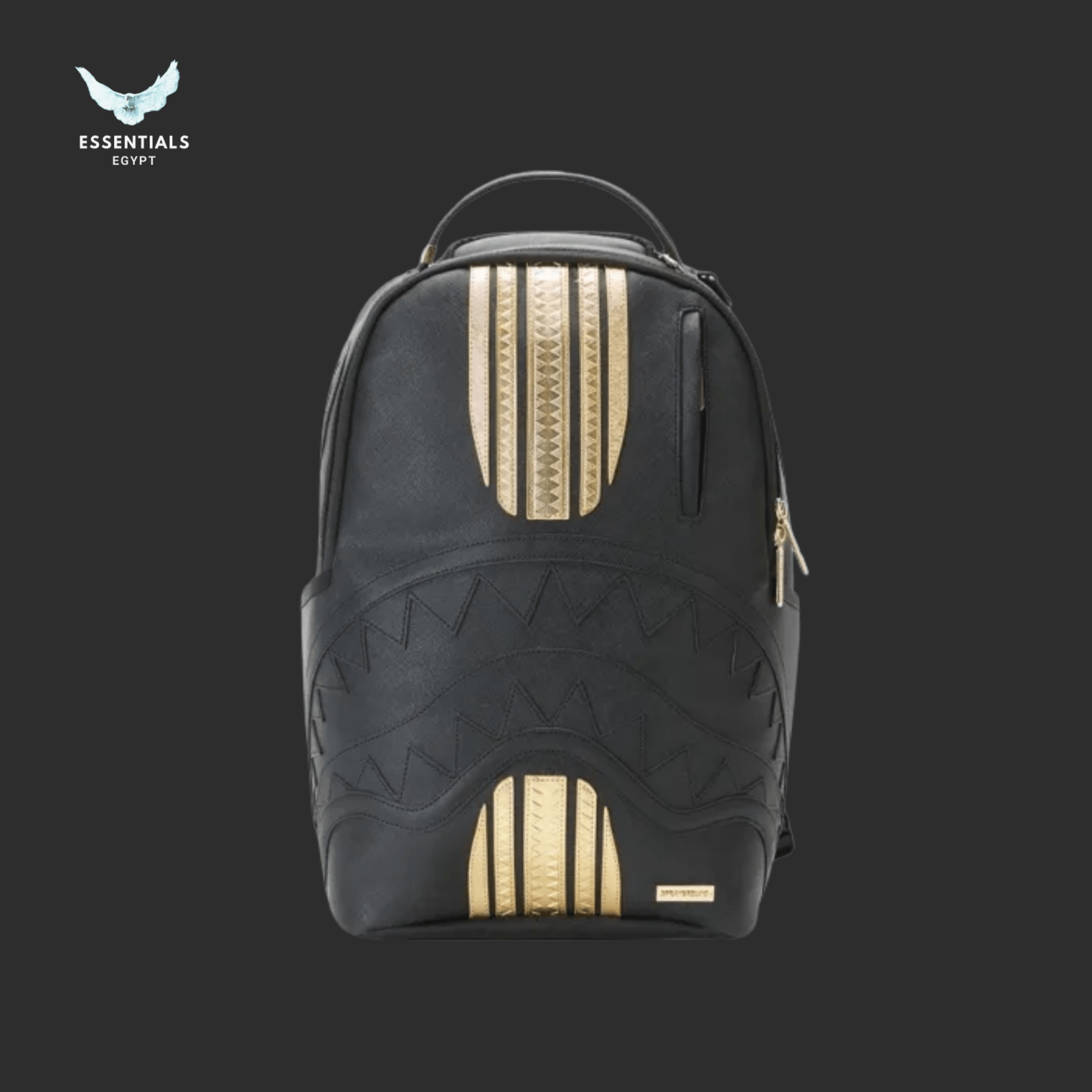Sleek black backpack with gold zippers and subtle shark emboss. Statement streetwear style. Egypt delivery available. Dimensions: 45.7 cm × 15.2 cm × 29.2 cm.