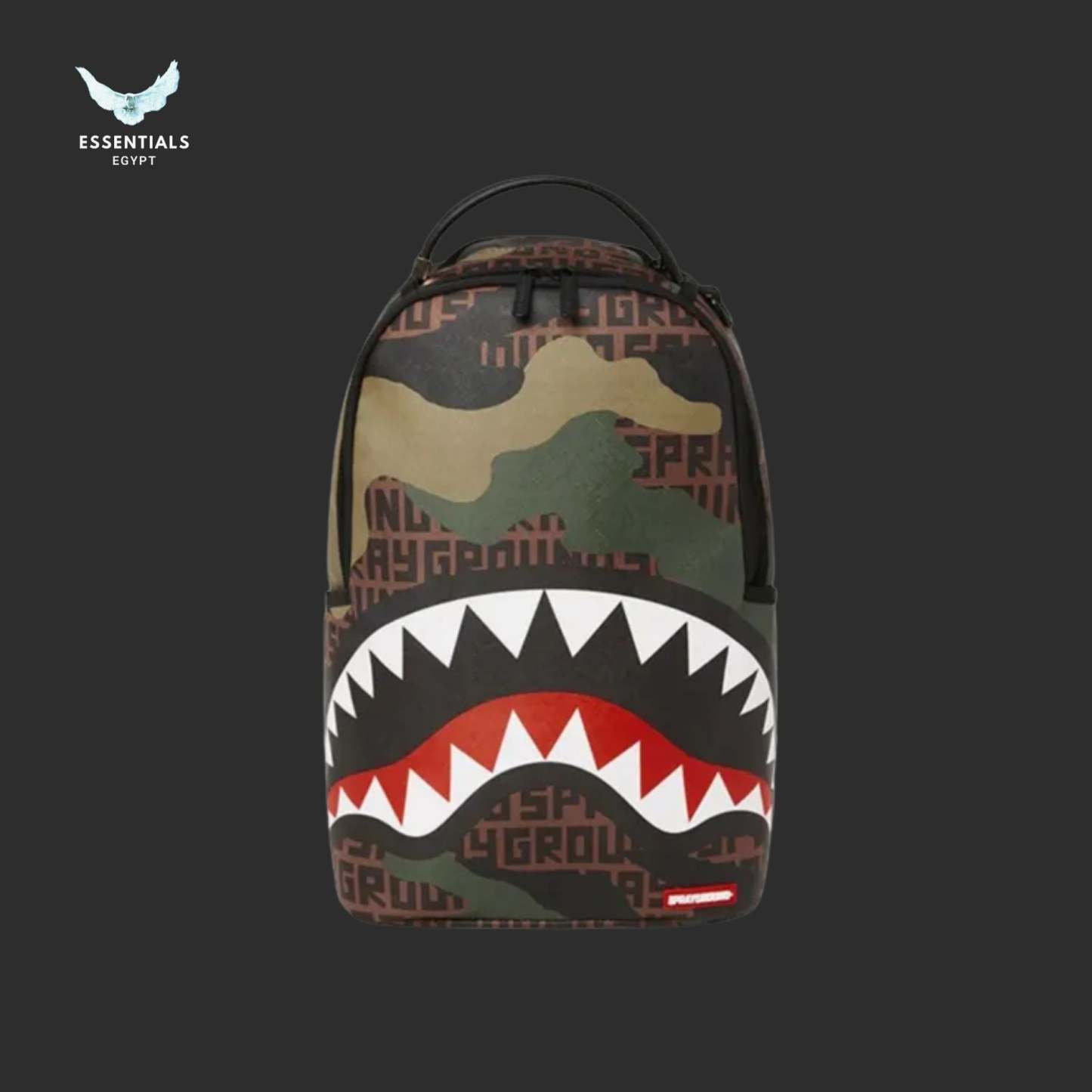 Rugged green camo backpack with bold shark mouth design. 100% authentic, perfect for streetwear lovers in Egypt. Dimensions: 45.7 cm × 15.2 cm × 29.2 cm.