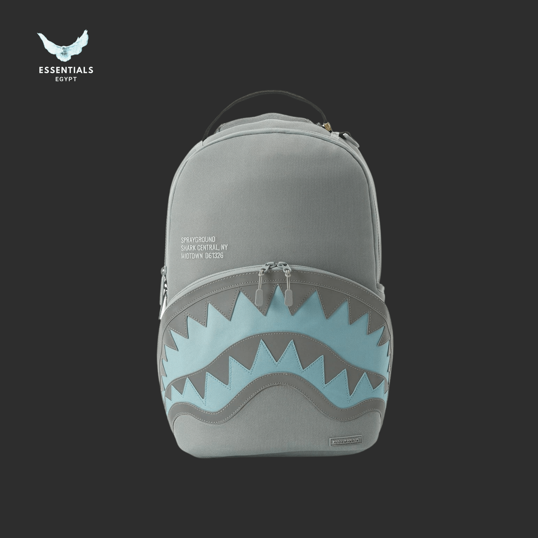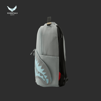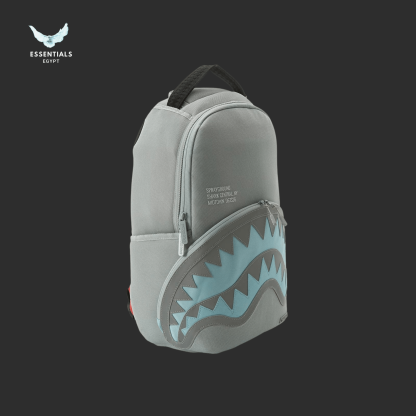 Grey backpack with striking aqua blue shark-mouth print. Sleek urban style. Egypt delivery available. Dimensions: 45.7 cm × 15.2 cm × 29.2 cm.
