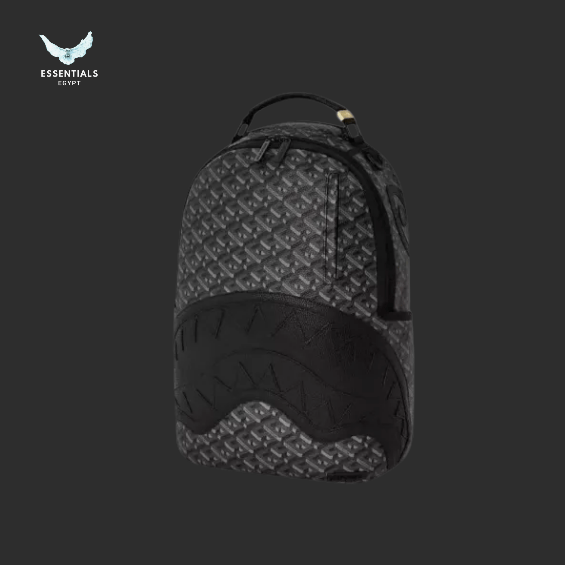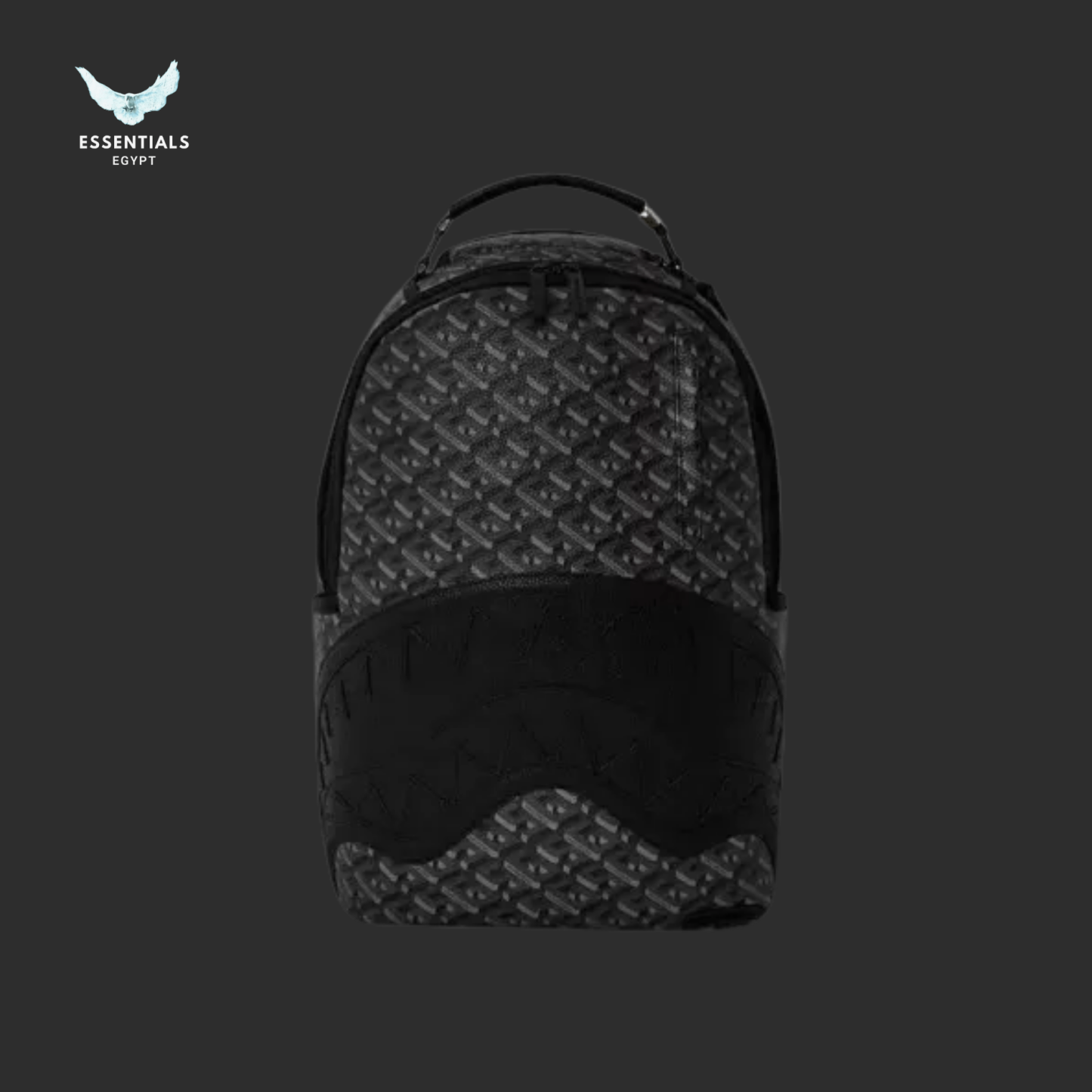 Monogram black backpack with embossed shark detailing. 100% authentic, designed for streetwear lovers in Egypt. Dimensions: 45.7 cm × 15.2 cm × 29.2 cm.