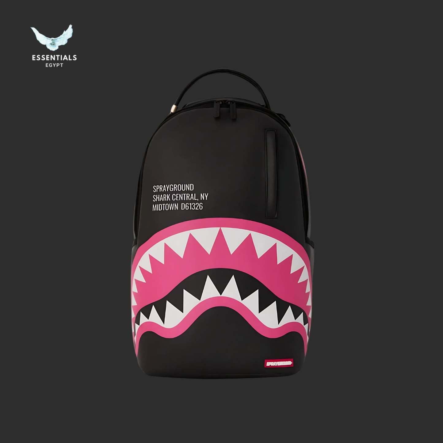 Grid black backpack with bold pink shark teeth. High-contrast streetwear edge. Dimensions: 45.7 cm × 15.2 cm × 29.2 cm.