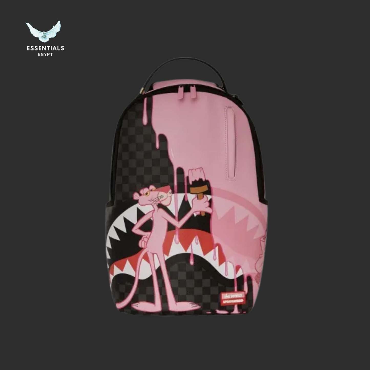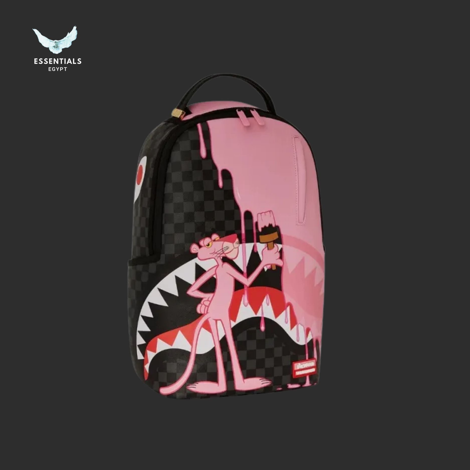 Black checkerboard backpack with pink drip and Pink Panther graphic plus shark mouth. 100% authentic in Egypt. Dimensions: 45.7 cm × 15.2 cm × 29.2 cm.