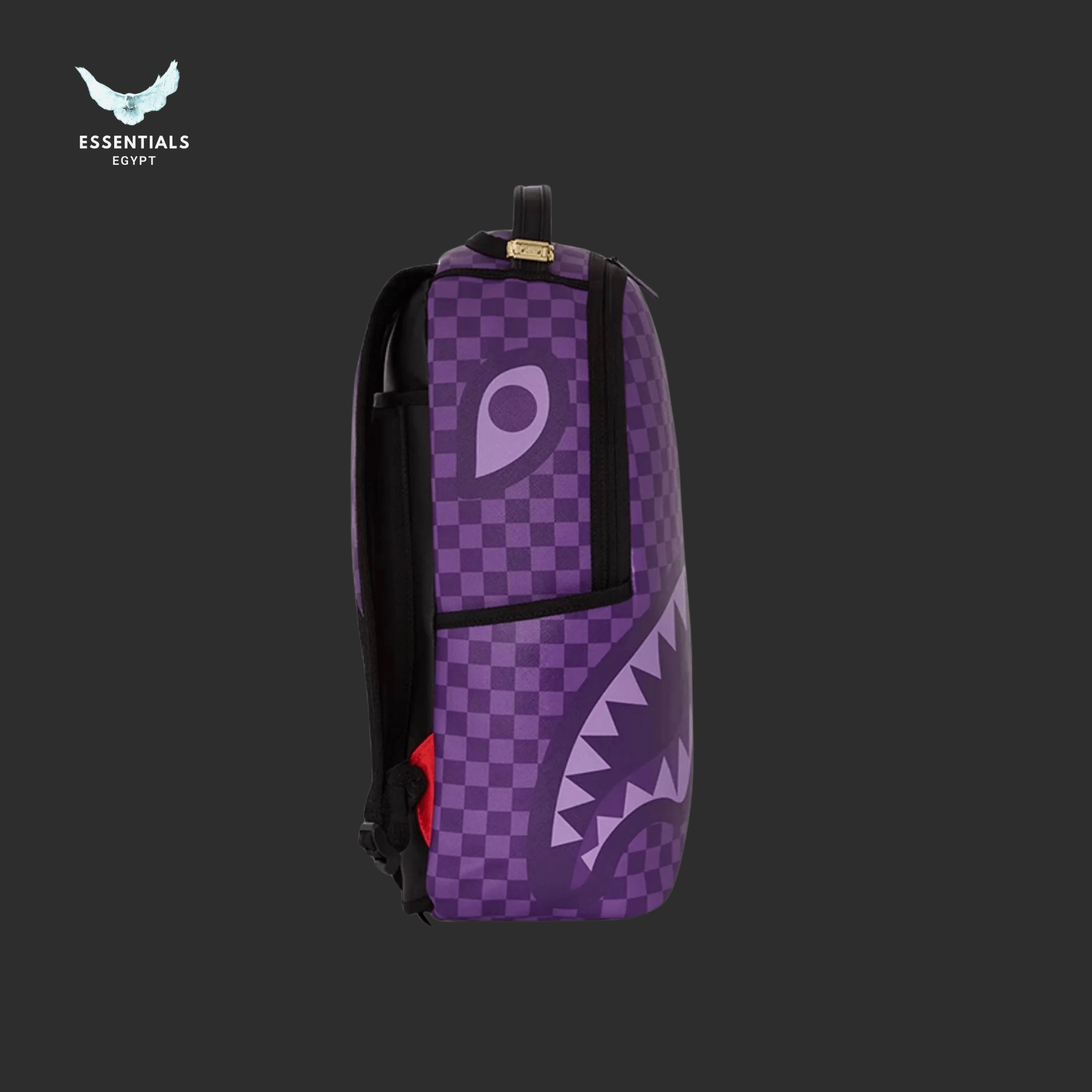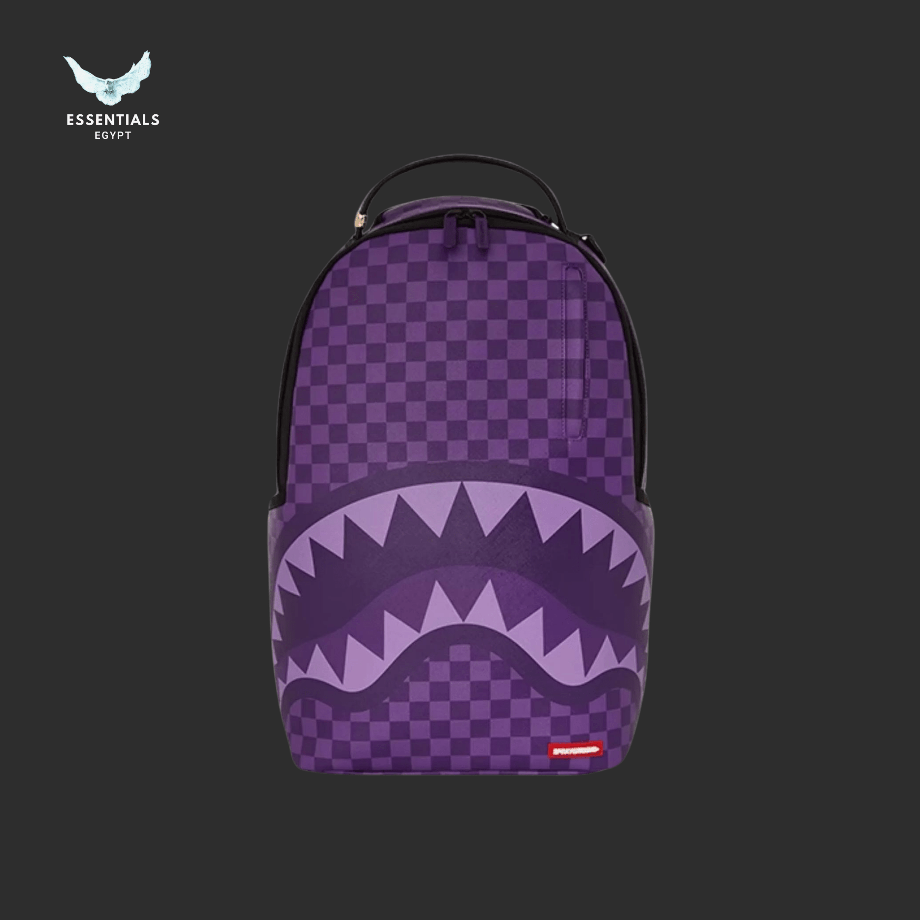 Purple and black checkered backpack with signature shark-mouth graphic. Bold streetwear style. Egypt delivery available. Dimensions: 45.7 cm × 15.2 cm × 29.2 cm.