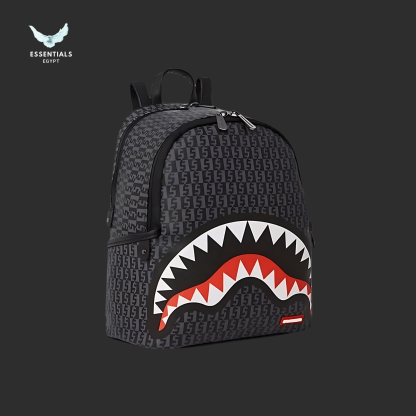 Black embossed backpack with shark bite and Sakura print detail. Stylish and sharp. Dimensions: 45.7 cm × 15.2 cm × 29.2 cm