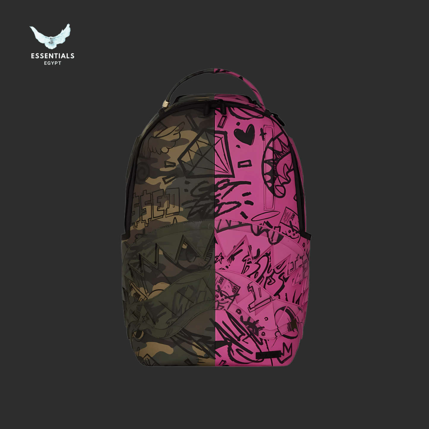 Sprayground backpack with half camo and half pink graphic shark design. 100% authentic. Egypt delivery. Dimensions: 45.7 cm × 15.2 cm × 29.2 cm.