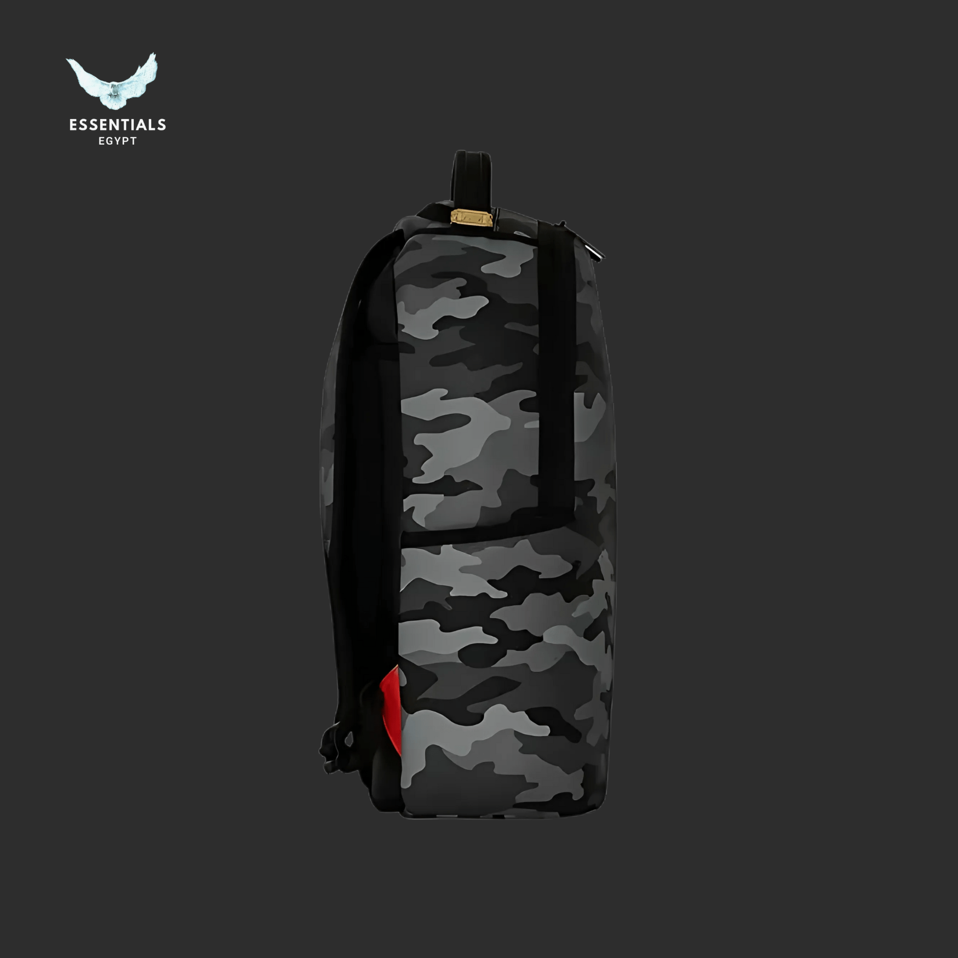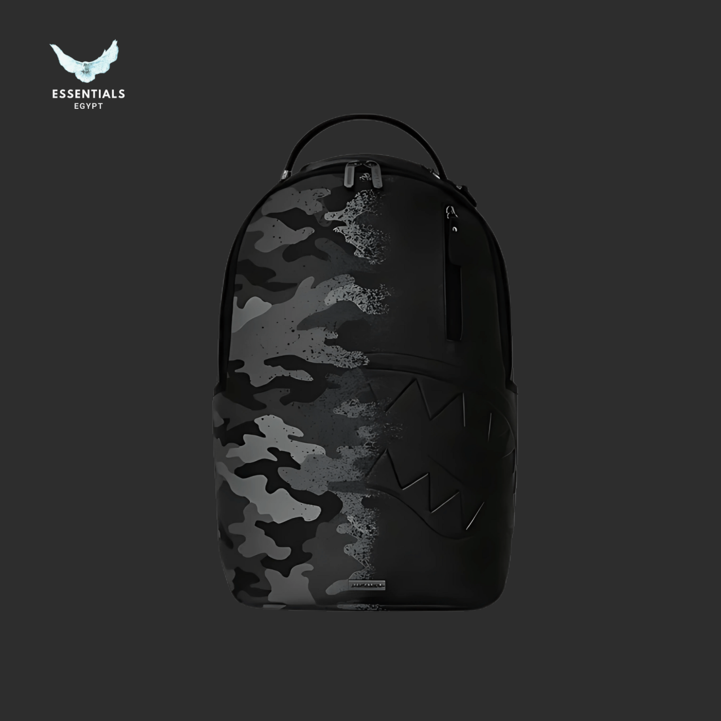 Dark camo Sprayground backpack with subtle shark mouth outline. Premium, sleek, and 100% authentic. Egypt delivery. Dimensions: 45.7 cm × 15.2 cm × 29.2 cm.