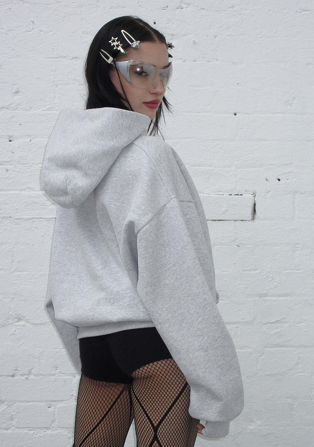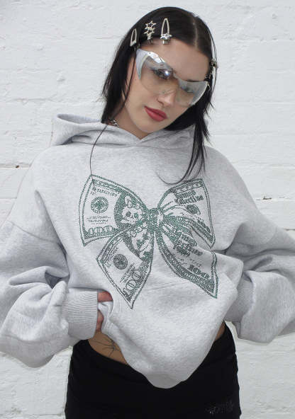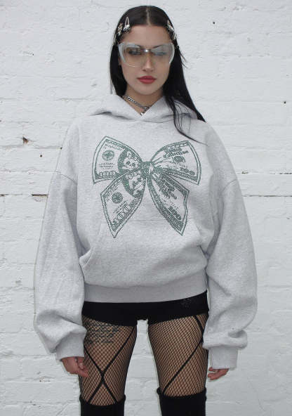 STRANGERS RHINESTONE $ BOW PULLOVER HOODIE GREY MARL