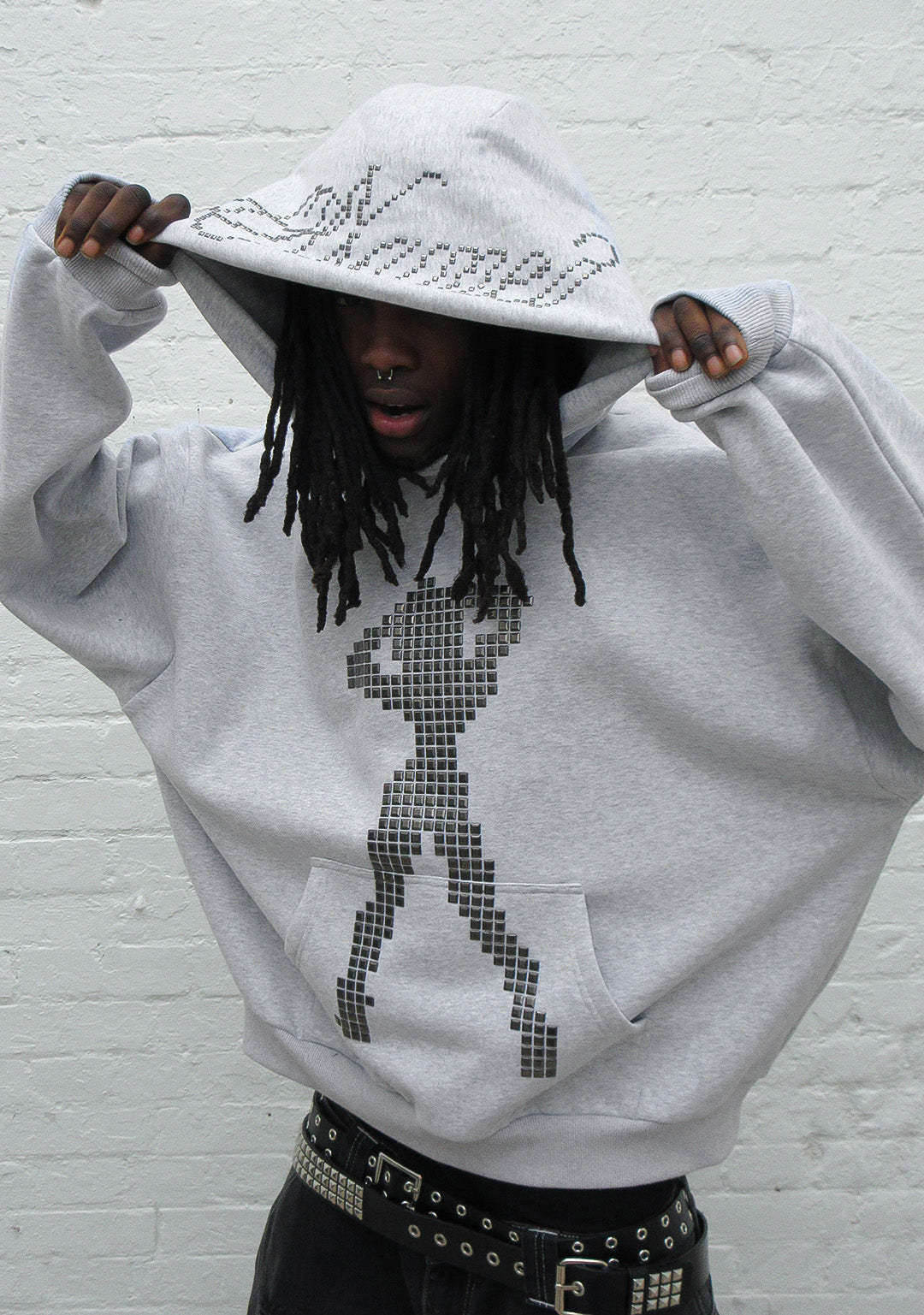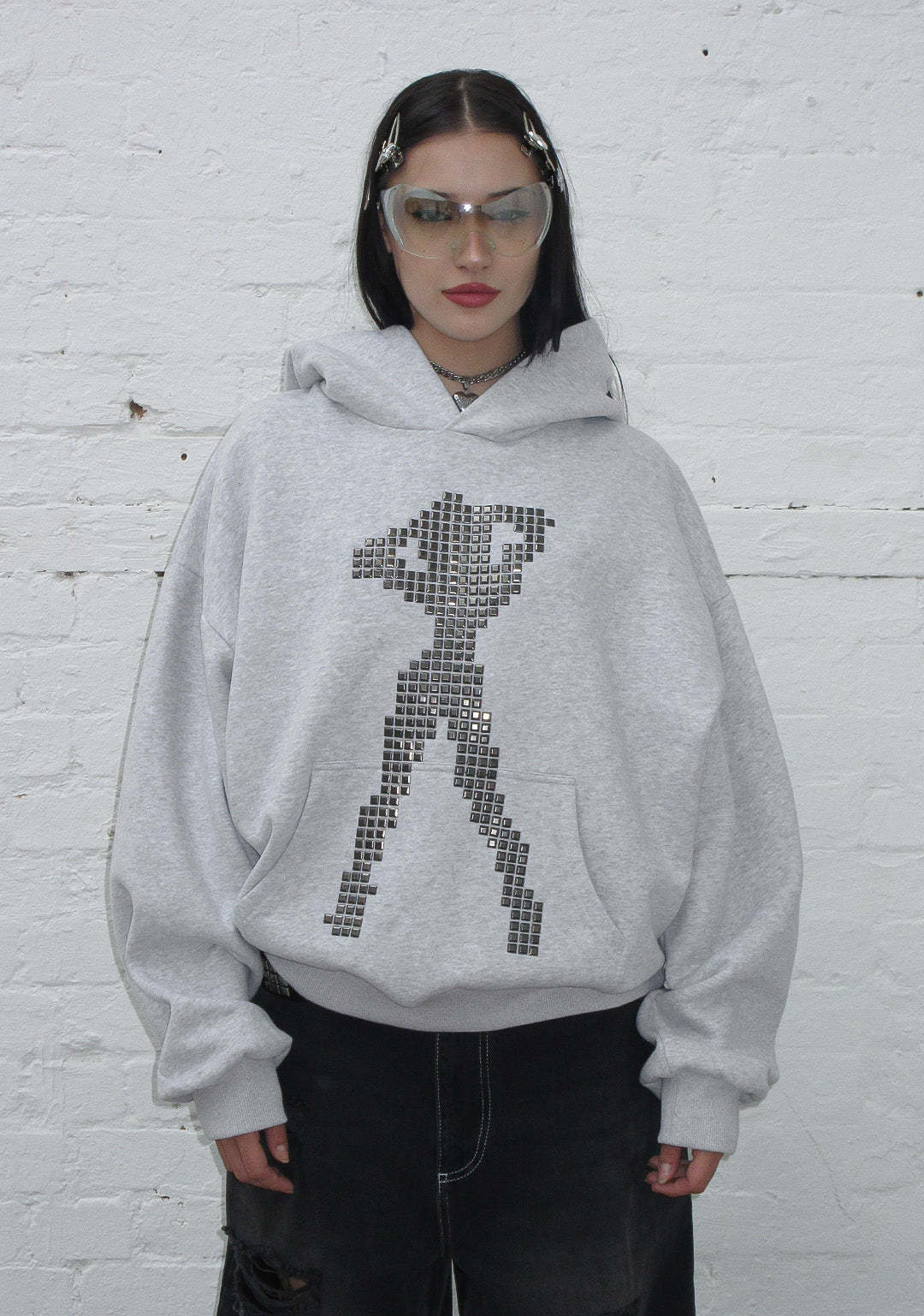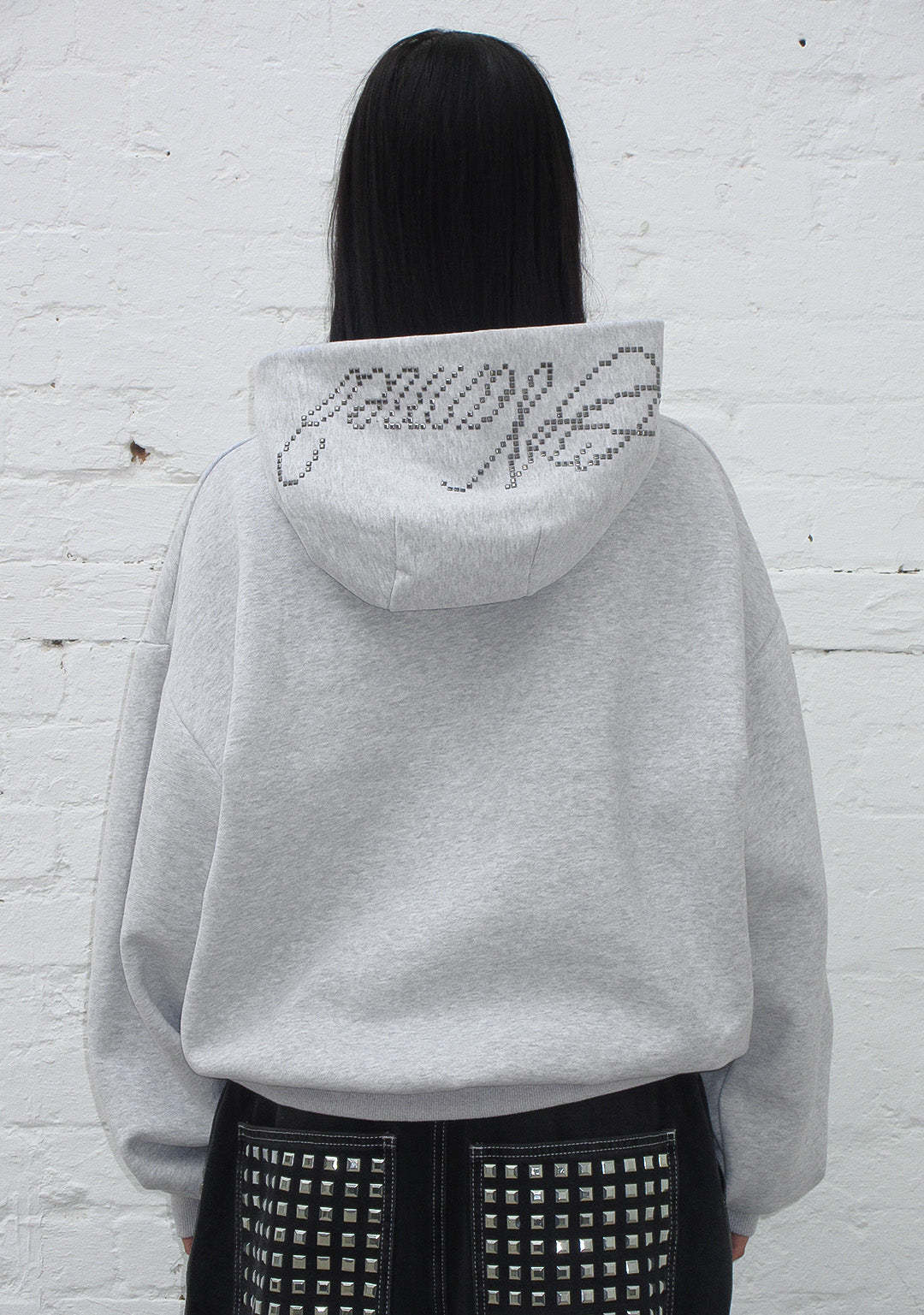 STRANGERS STUDDED SILHOUETTE PULLOVER HOODIE GREY MARL