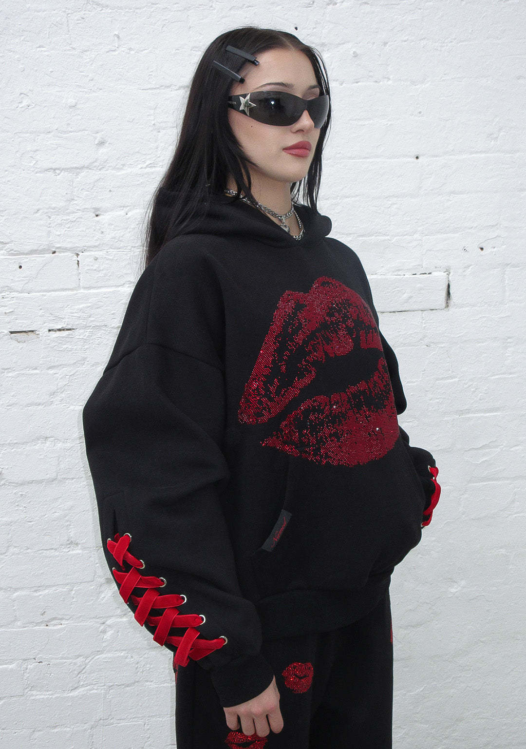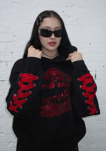 TEASE RHINESTONE KISS PULLOVER HOODIE BLACK