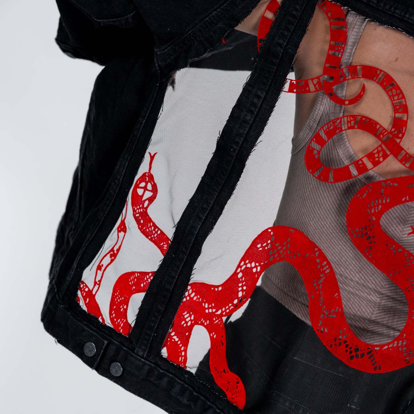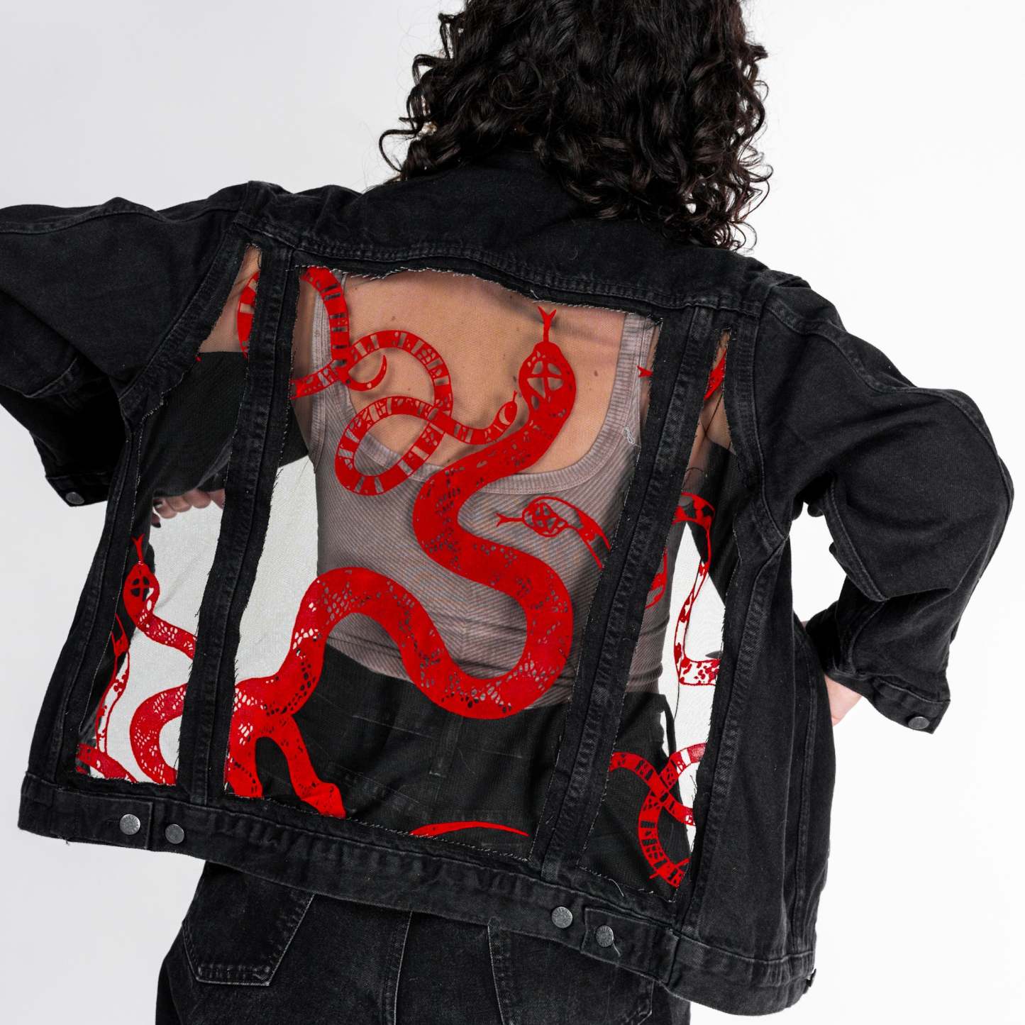 Red Velvet Snakes. Black Mesh. Blue or Black Denim.