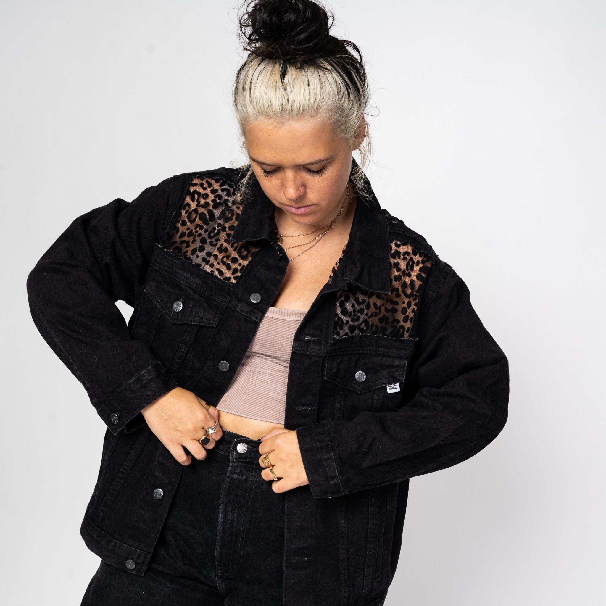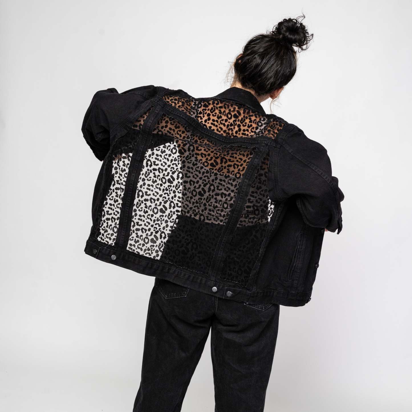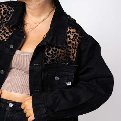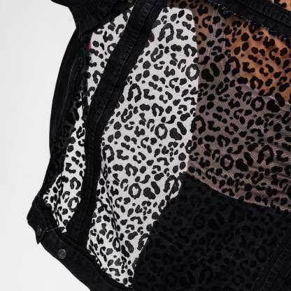 Black velvet cheetah print. Black mesh. Black, Grey, or Blue Denim.