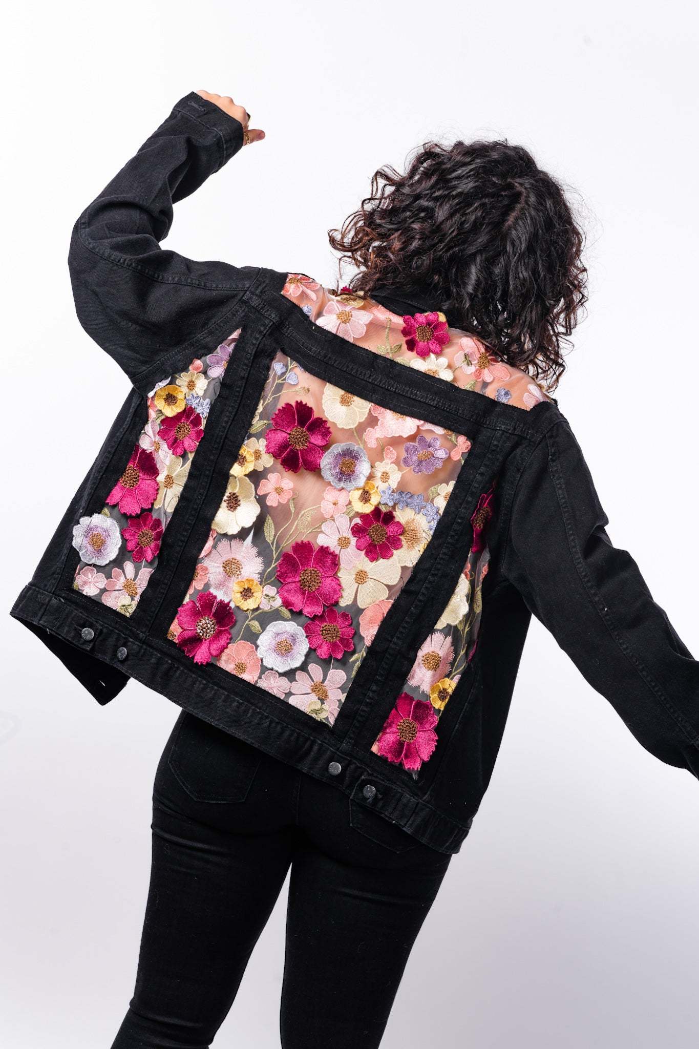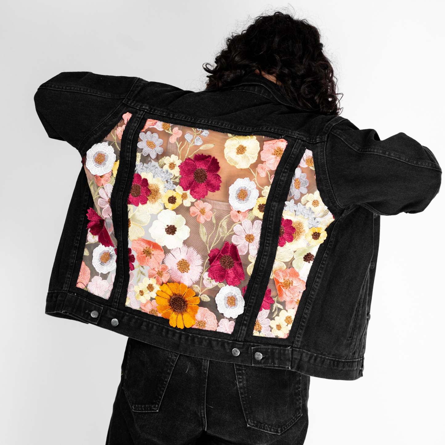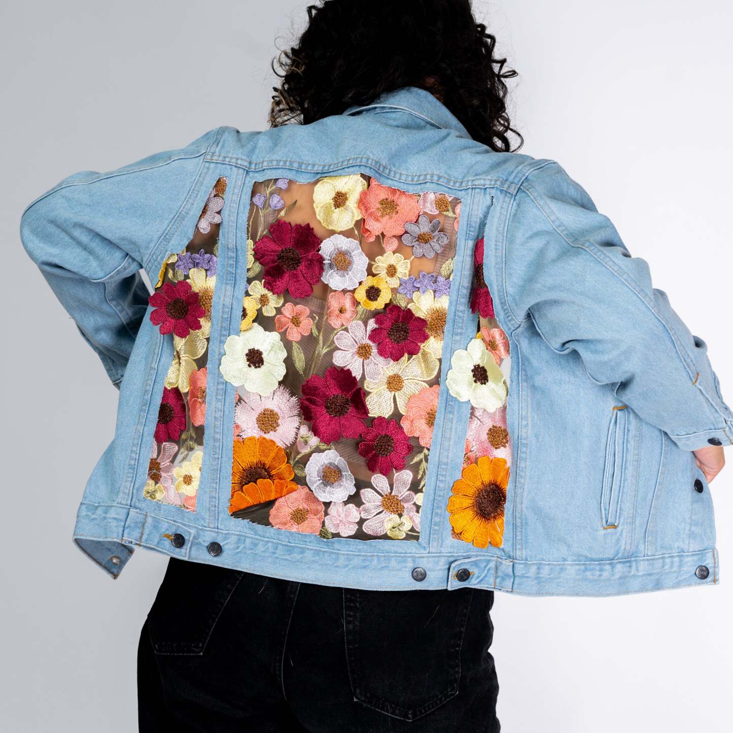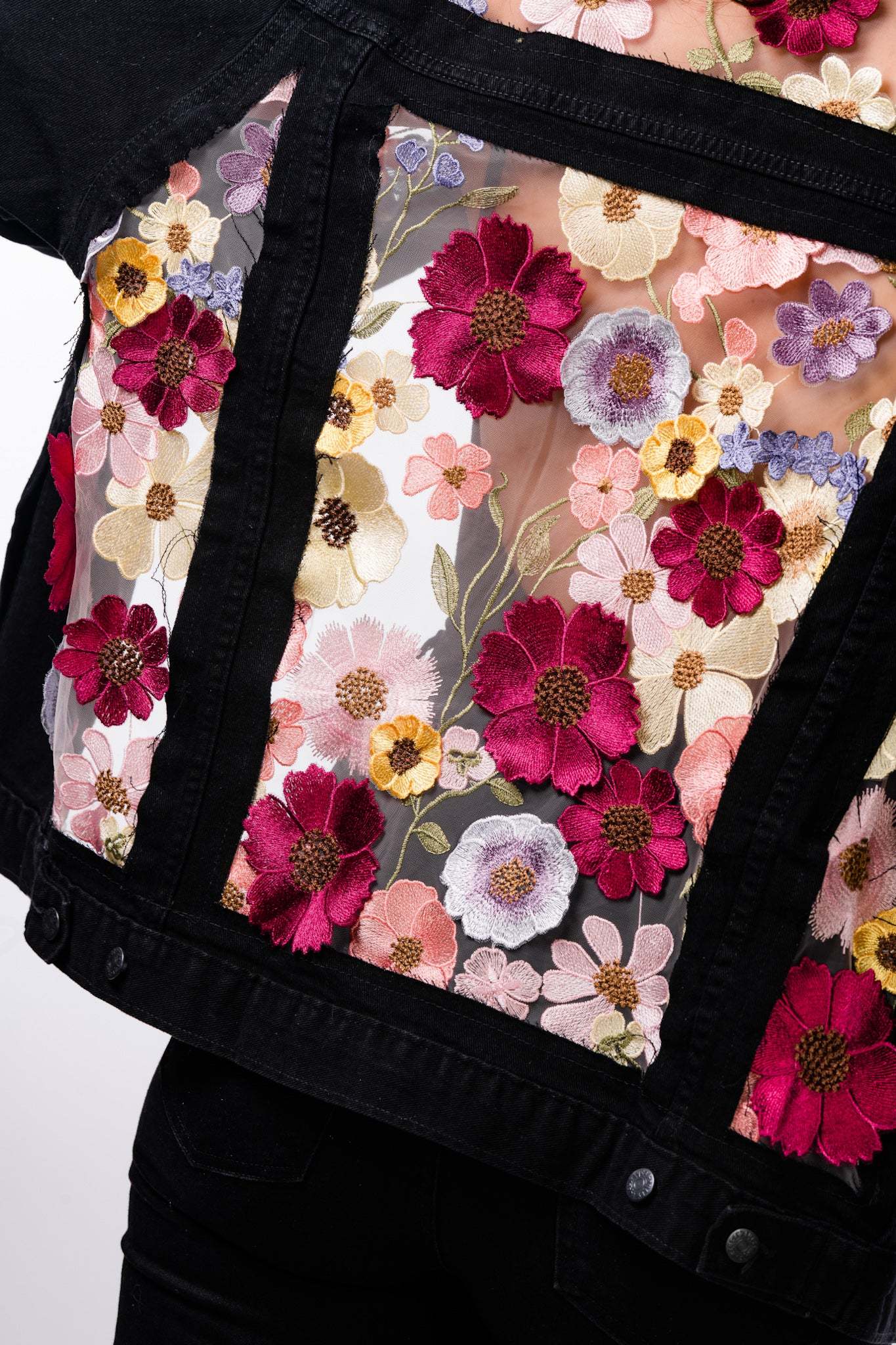 Embroidered & 3D Flowers. Tan Mesh. Blue or Black Denim.
